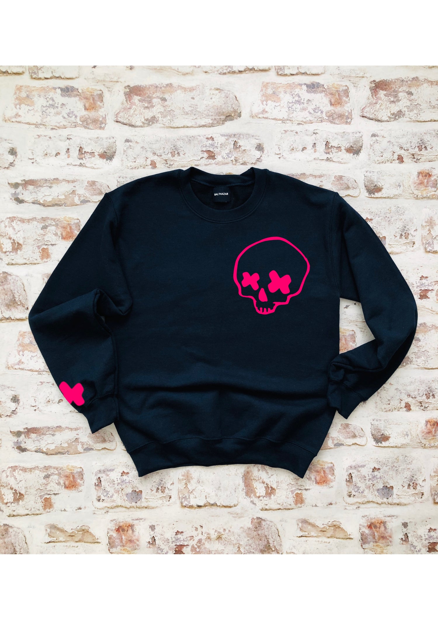 Featuring a hand drawn skull with block style cross eyes, a matching cross sits on the right sleeve