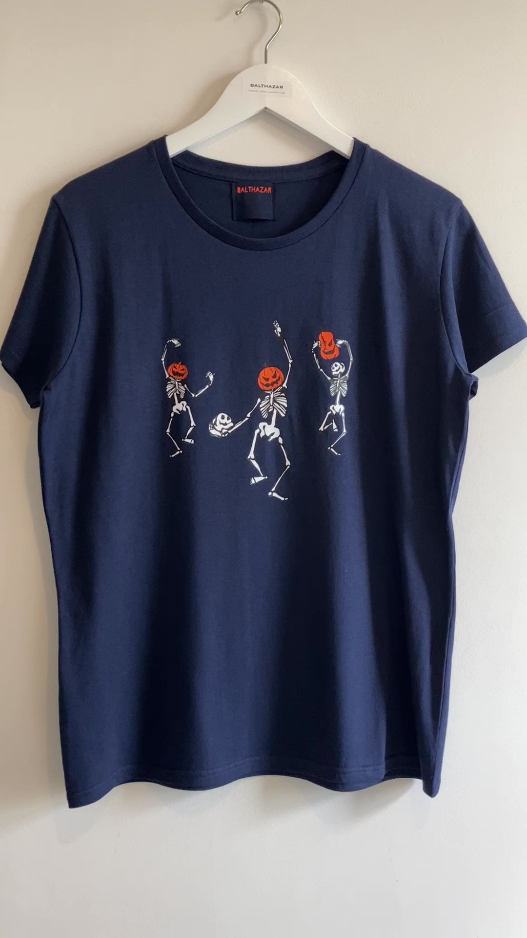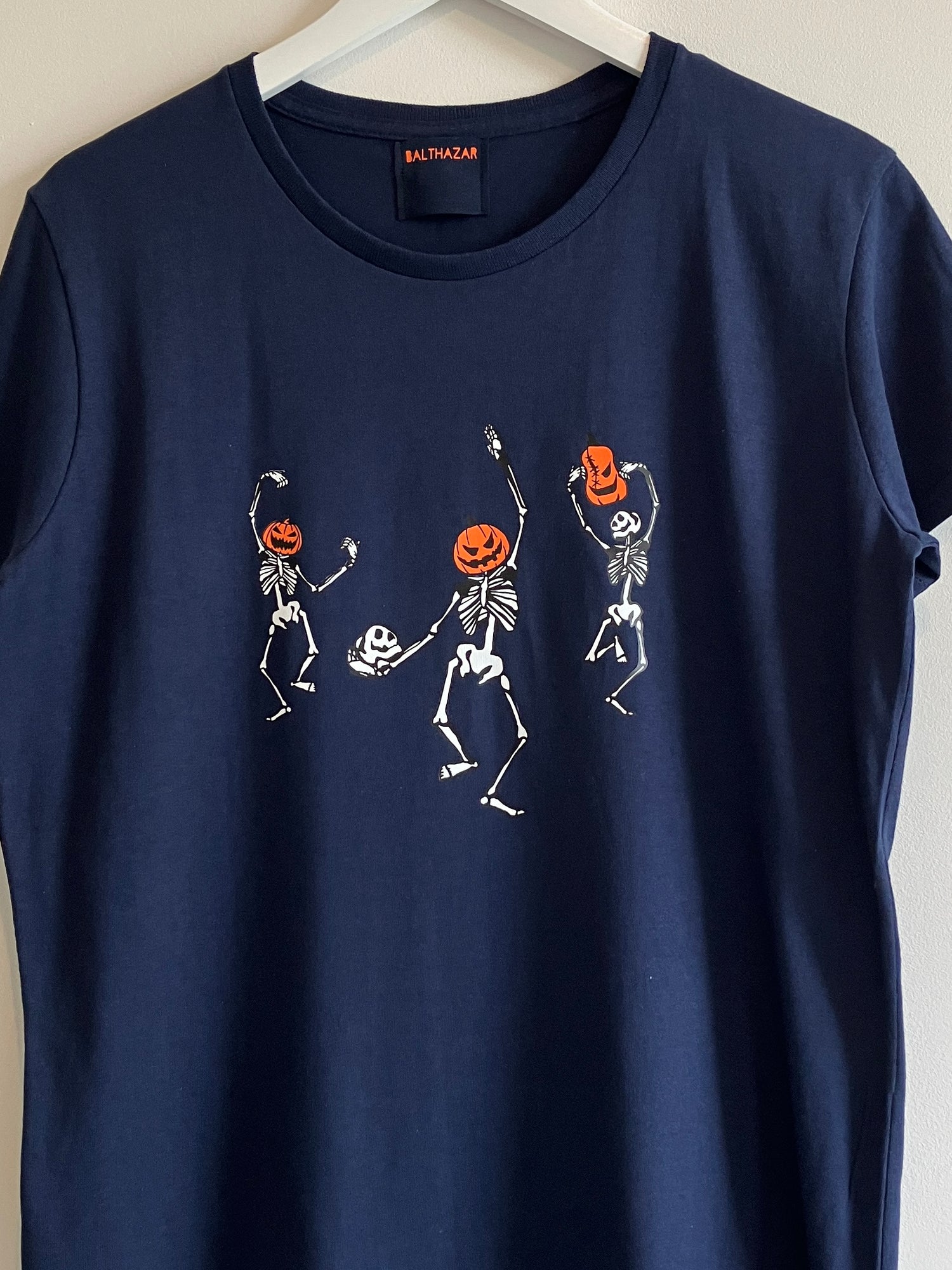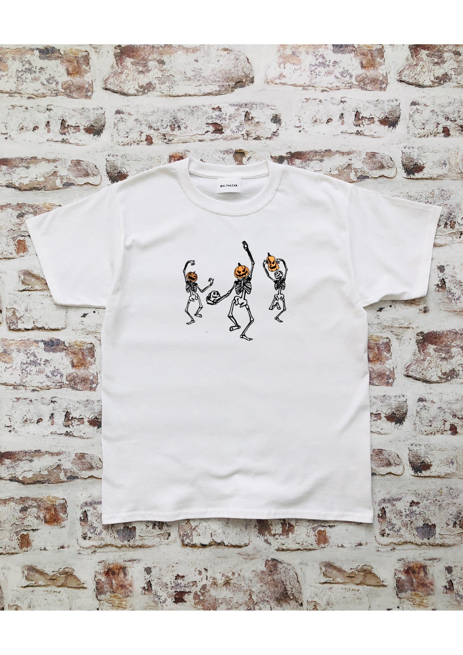 Our hand drawn dancing skeletons are super sassy with their vibrant orange pumpkin heads