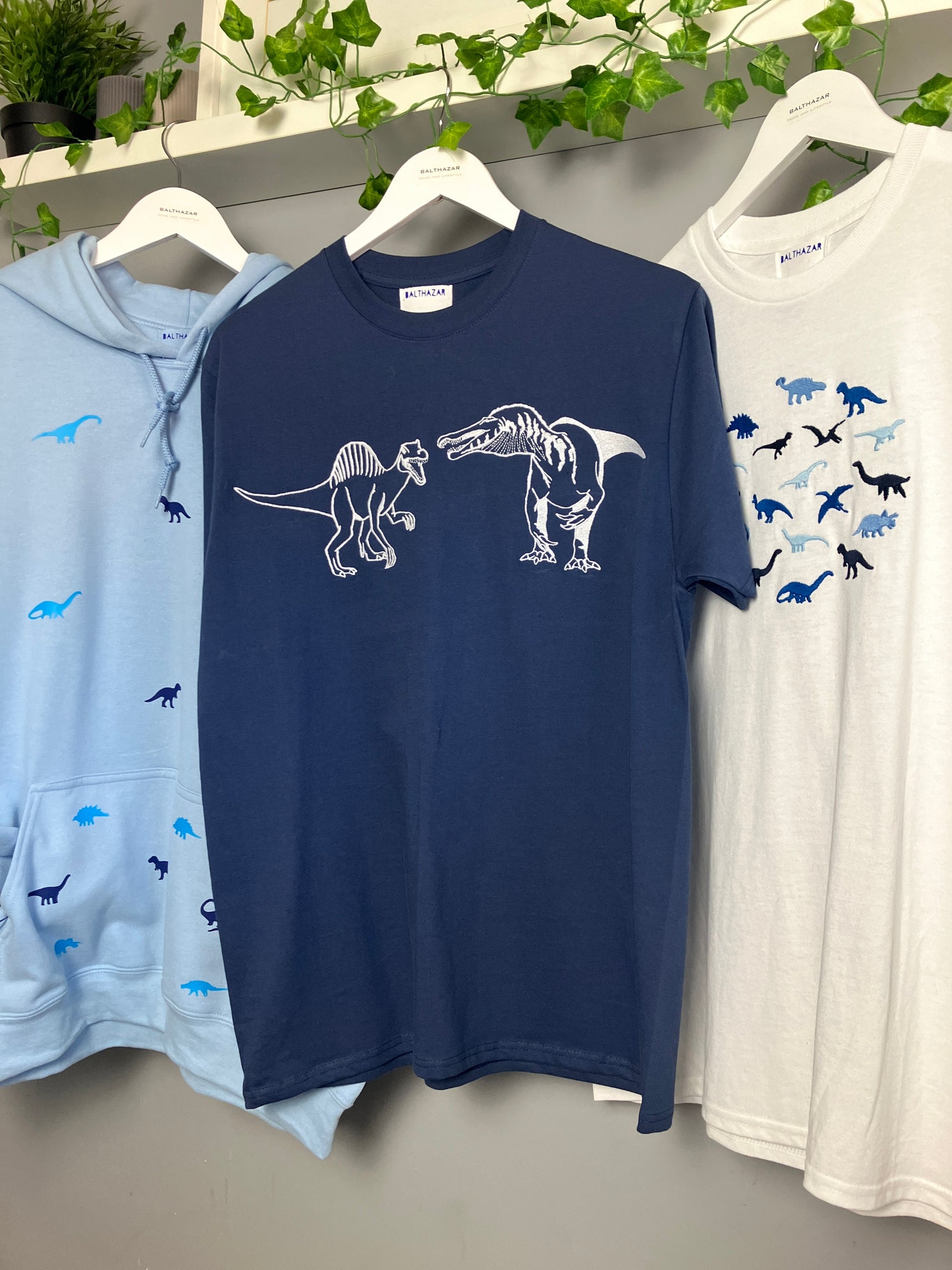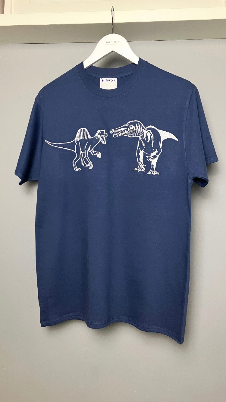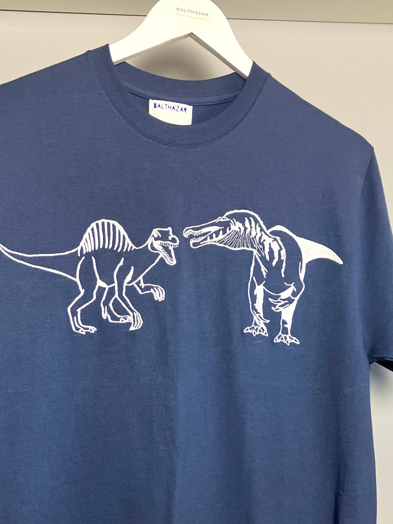 Introducing the ultimate custom embroidered t-shirt—where ferocious dinosaurs are about to face off! 🦕⚔️🦖 Forget basic, because this one’s all about bringing epic pre-historic battles right to your wardrobe. Whether you’re team Spinosaurus or rooting for the Baryonyx, there’s no escaping the fierce energy packed in this design.