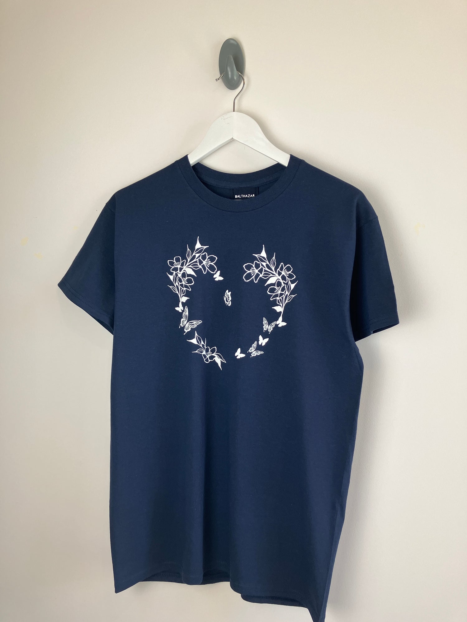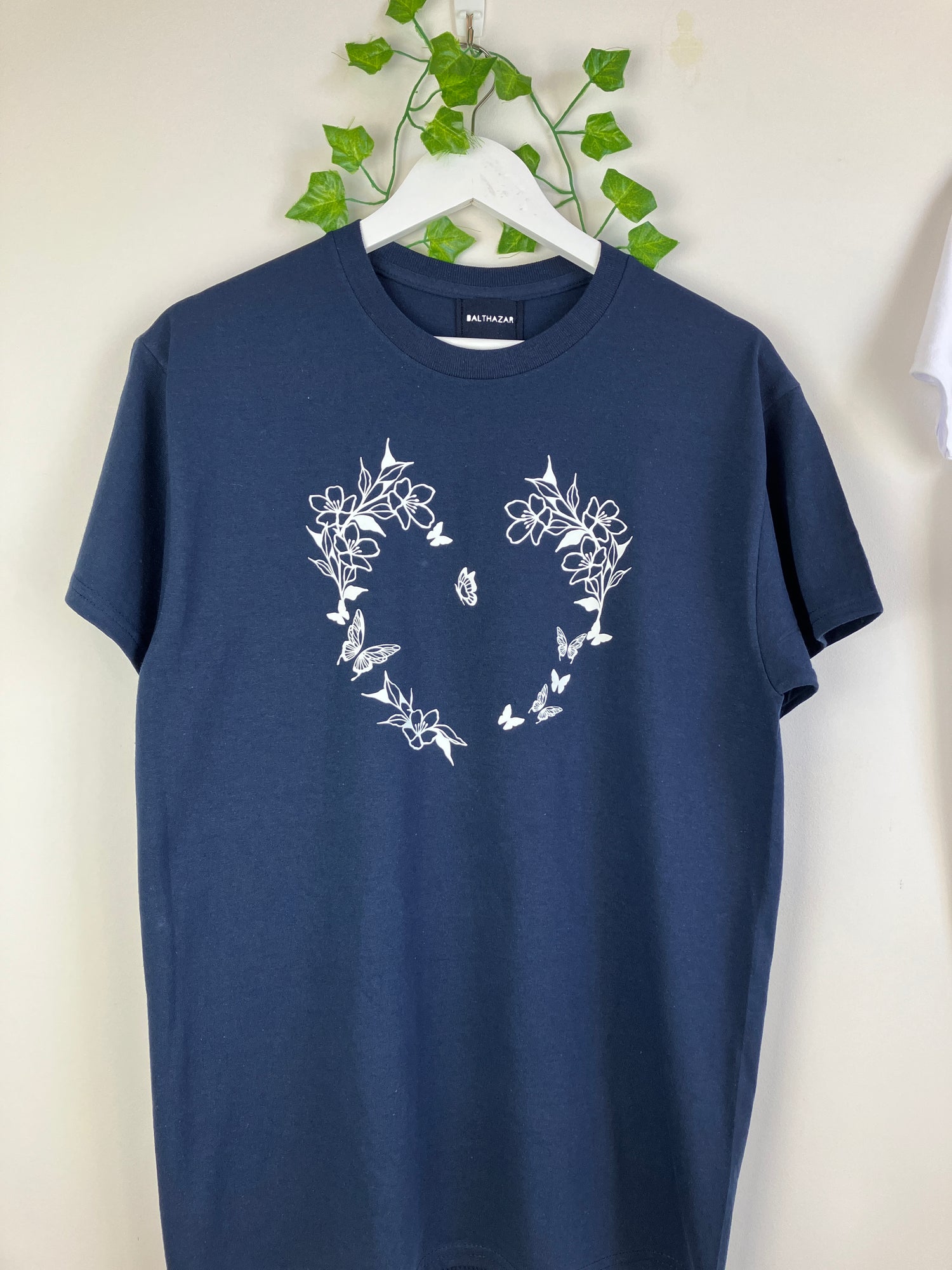 Featuring hand drawn flowers and butterflies arranged in a heart shape.