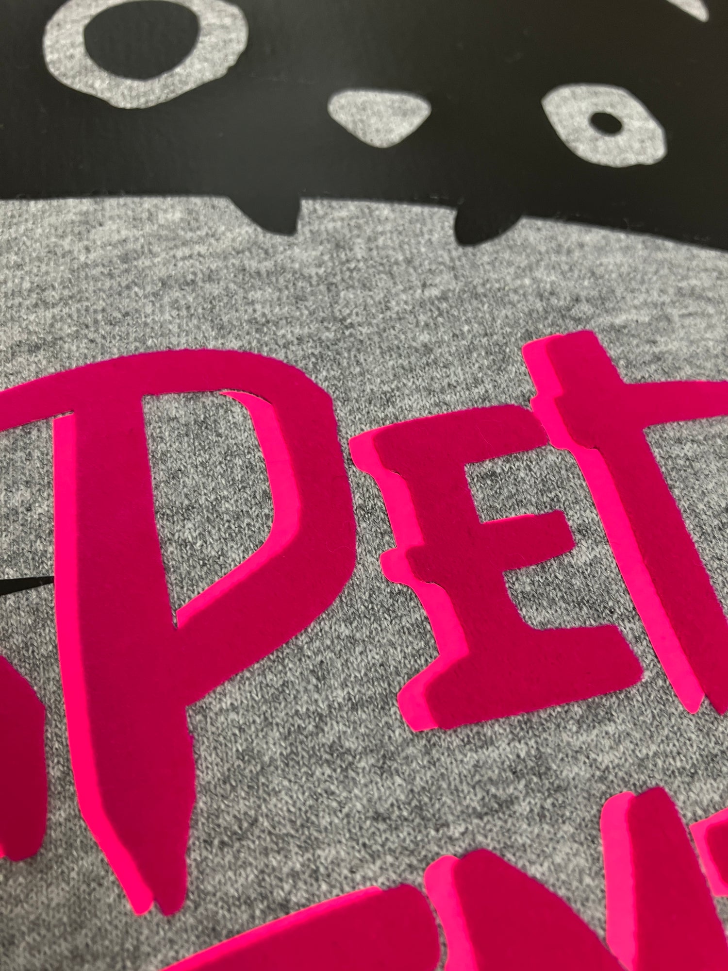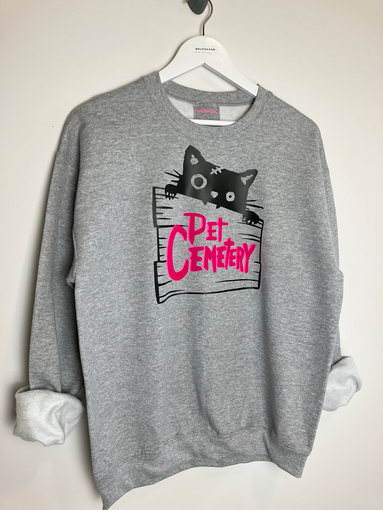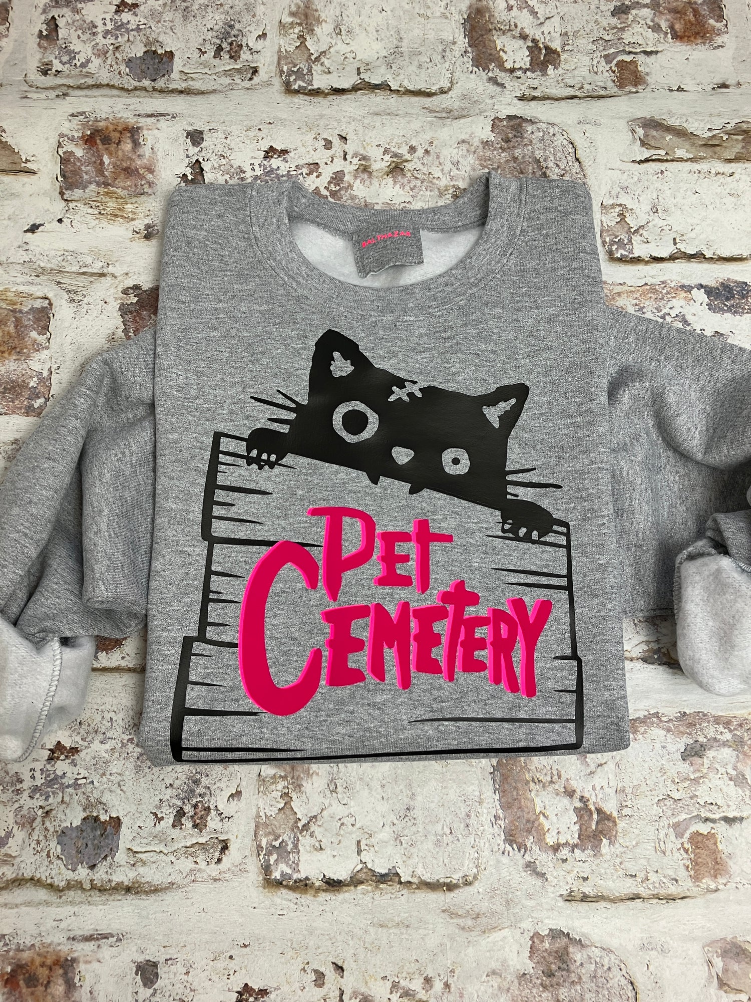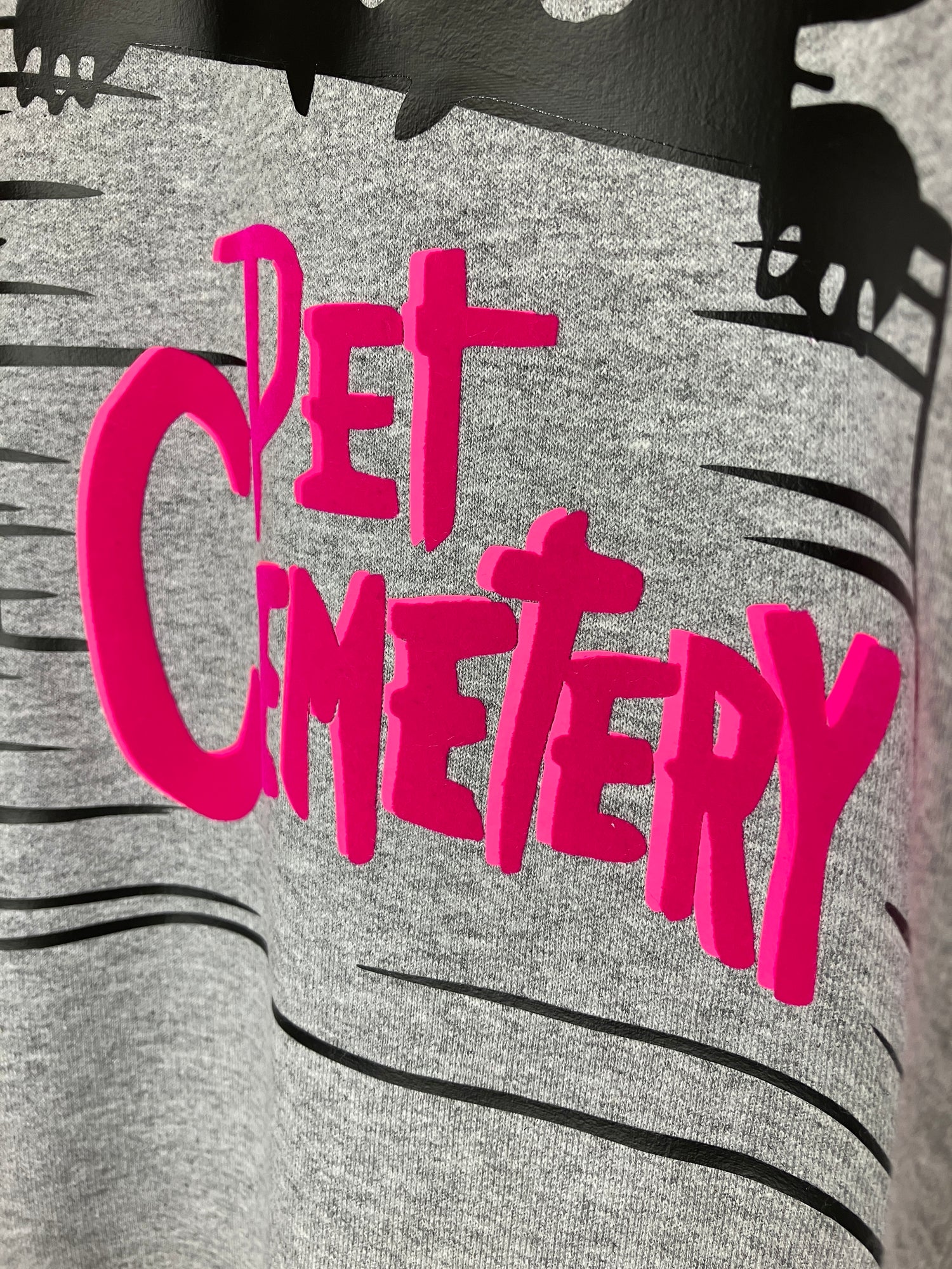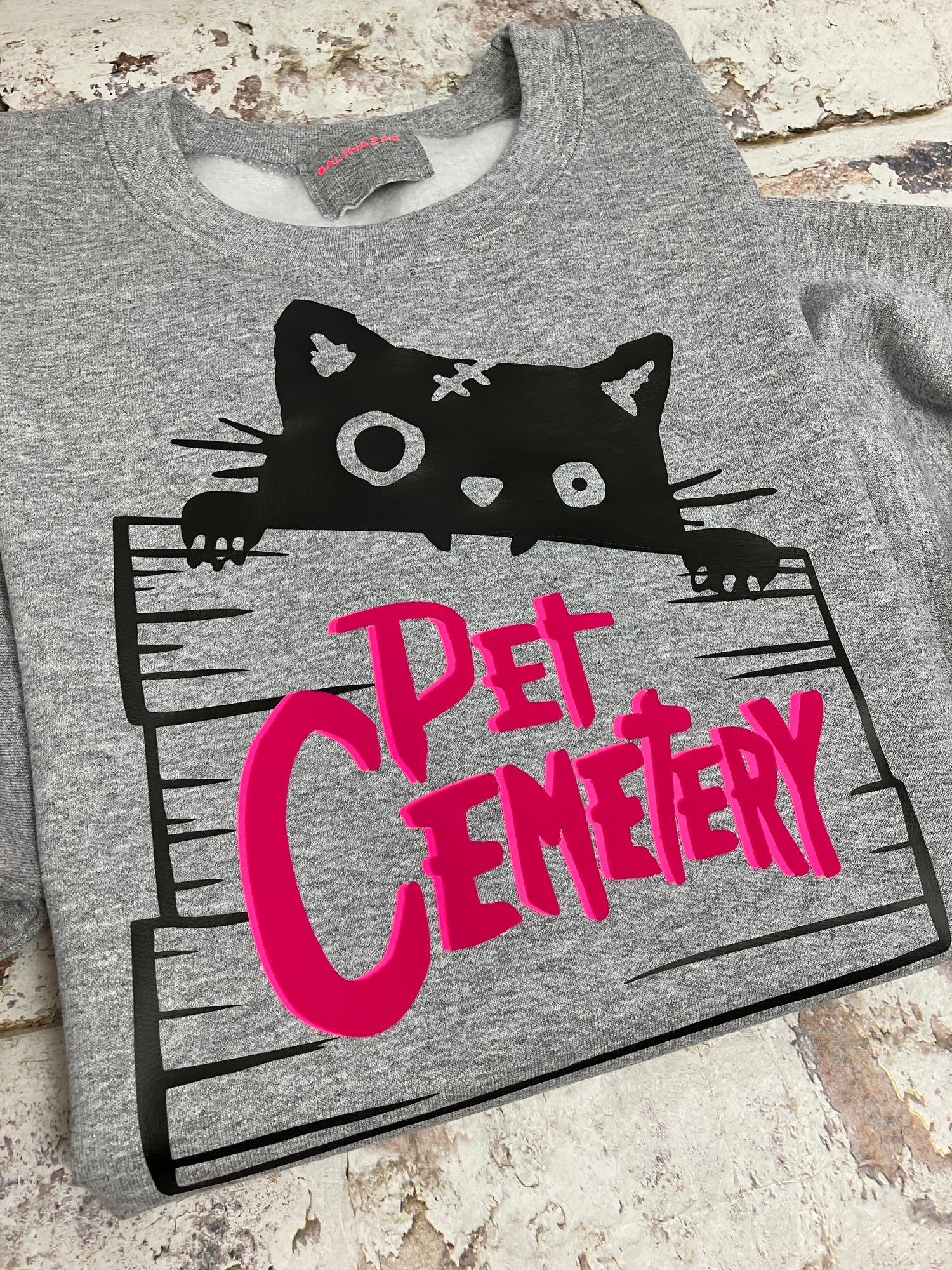 Super cute Franken-kitty sweatshirt has been hand drawn and cut from a mix of different vinyls, the Pet Cemetery text has been cut from neon pink and hot pink flocked vinyl