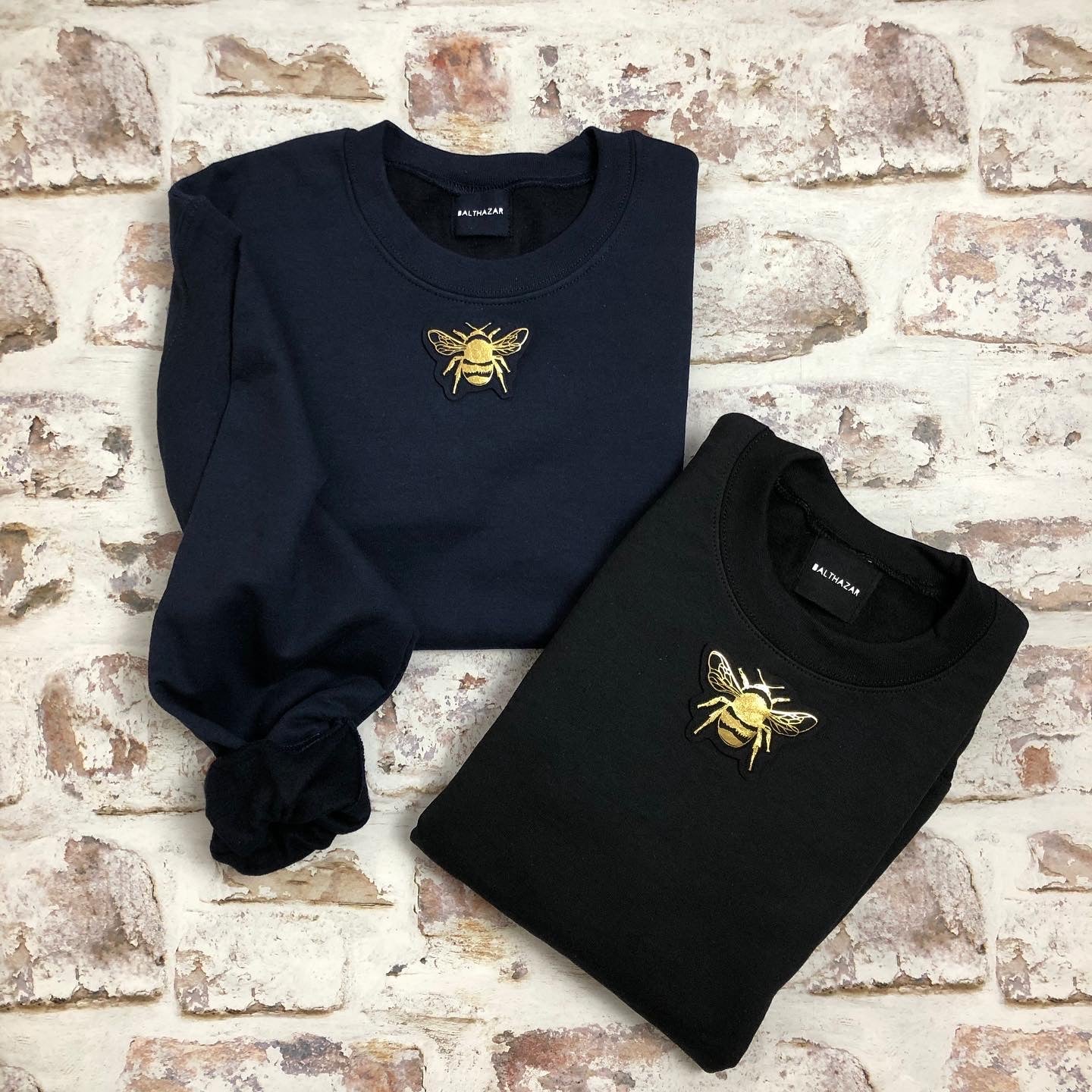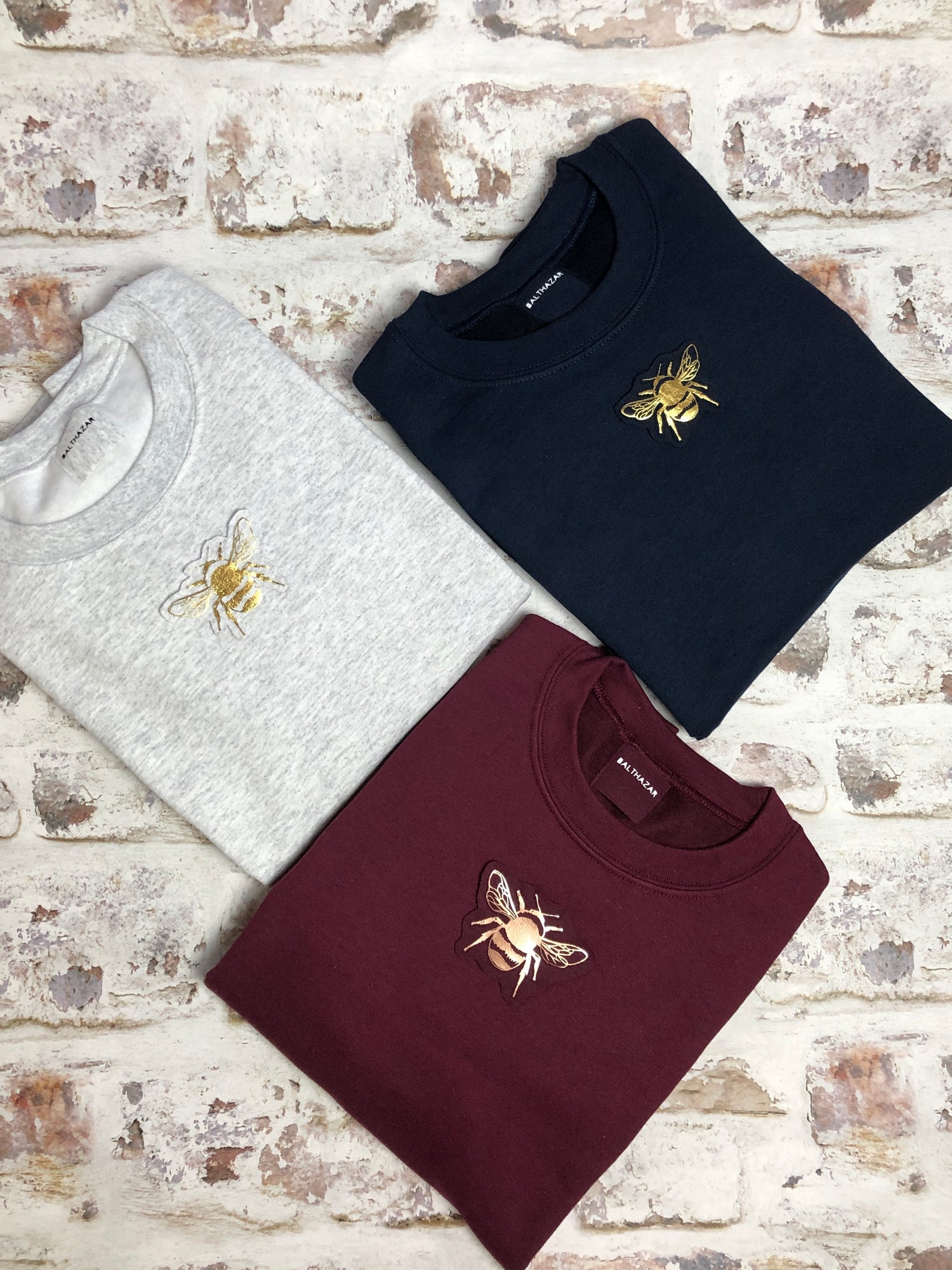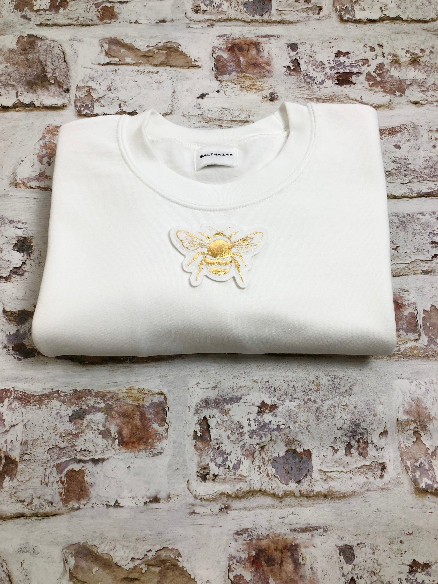 Our beautiful hand drawn bee cut from a choice of metallic vinyls, has been freehand stitched to soft padding before being cut and then stitched onto the cotton sweatshirts.