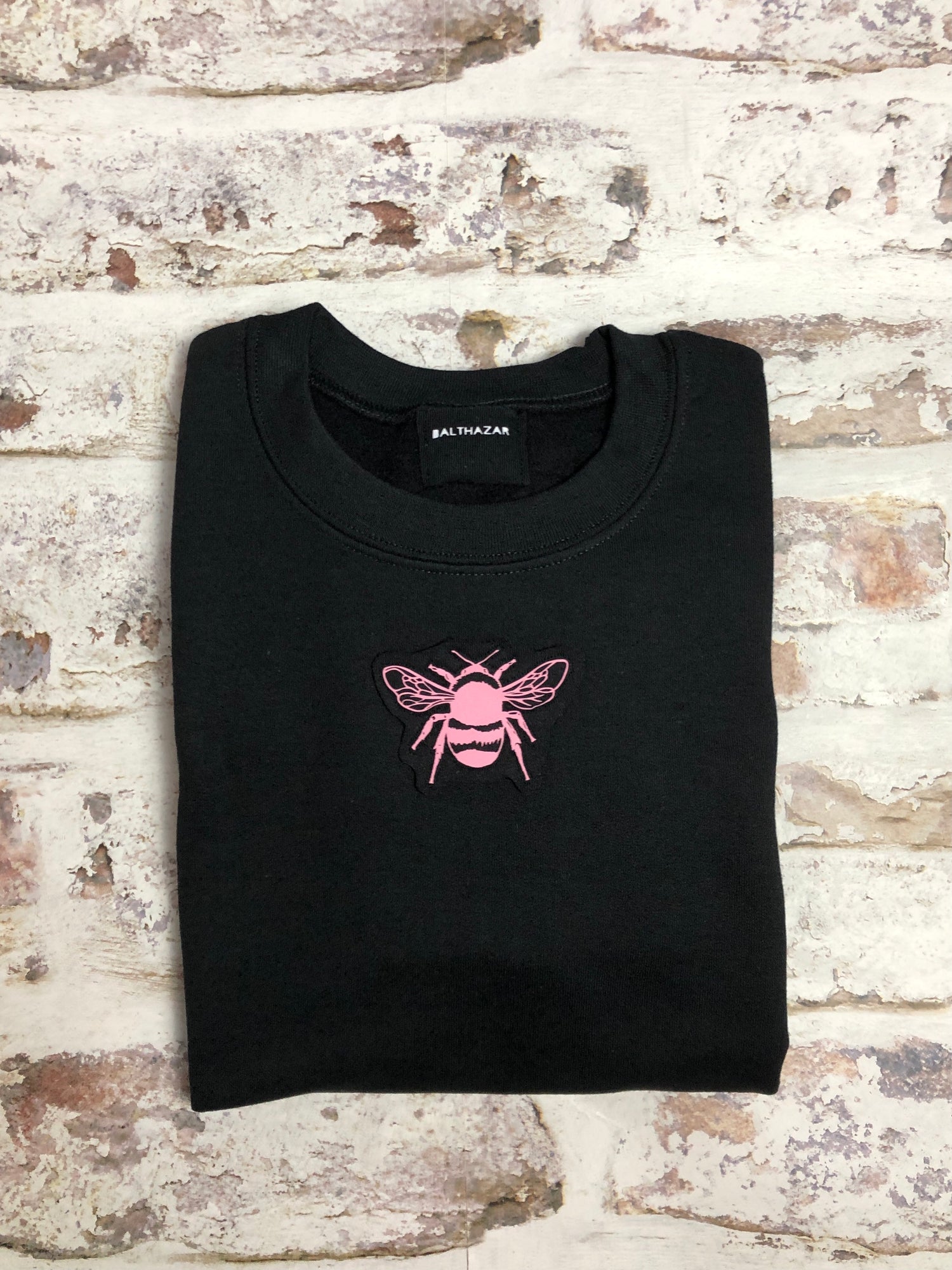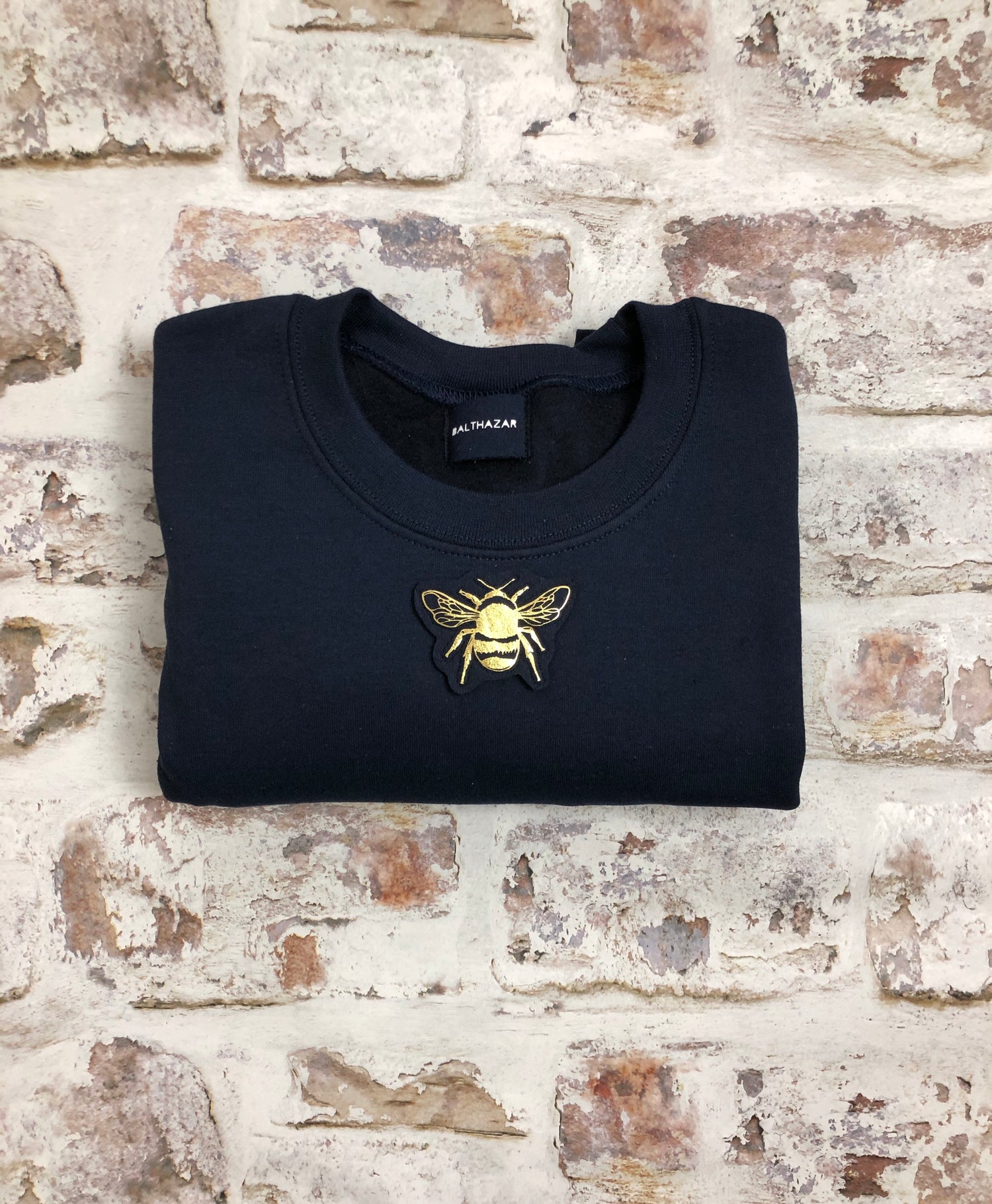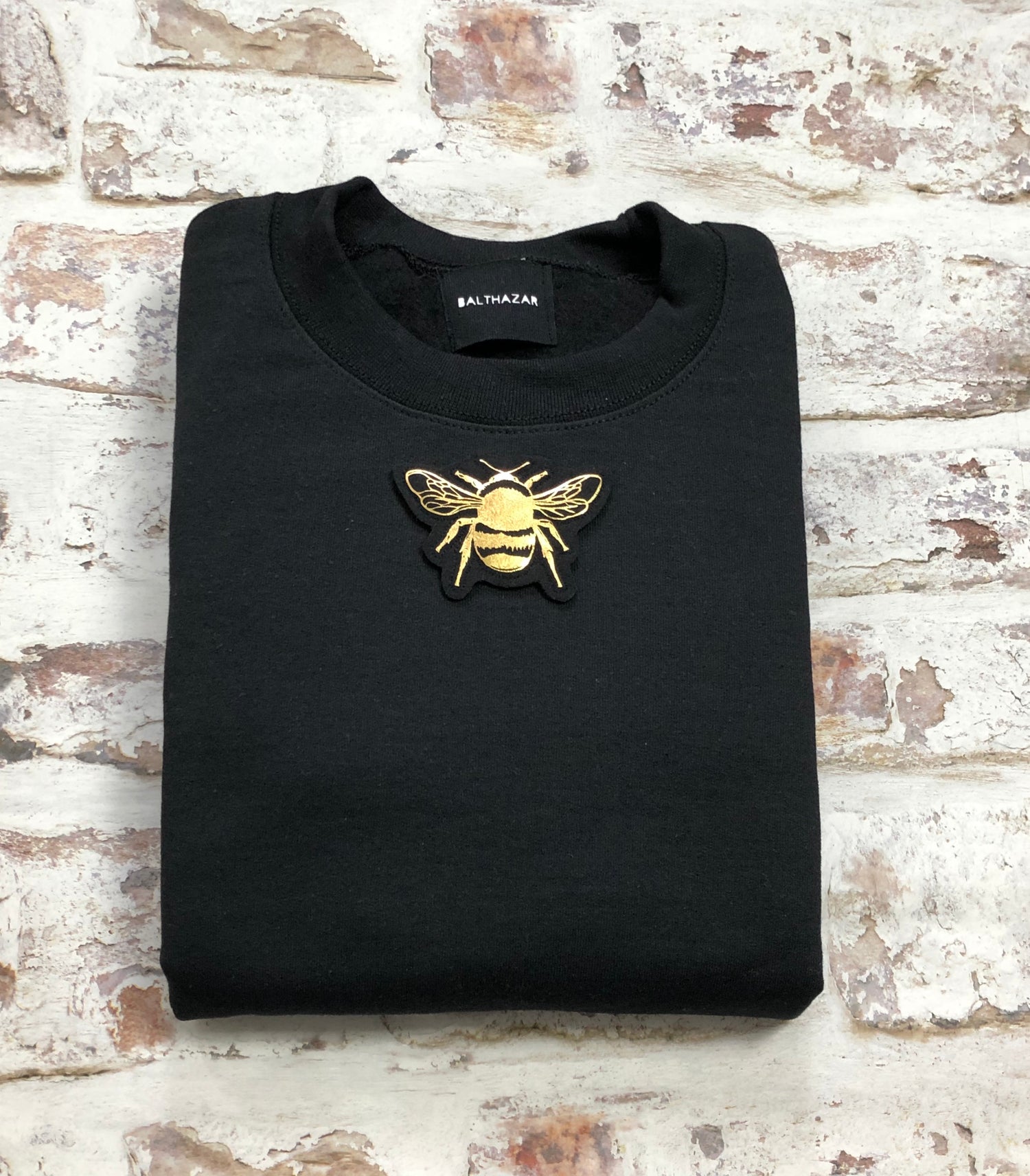 Our beautiful hand drawn bee cut from a choice of metallic vinyls, has been freehand stitched to soft padding before being cut and then stitched onto the cotton sweatshirts.