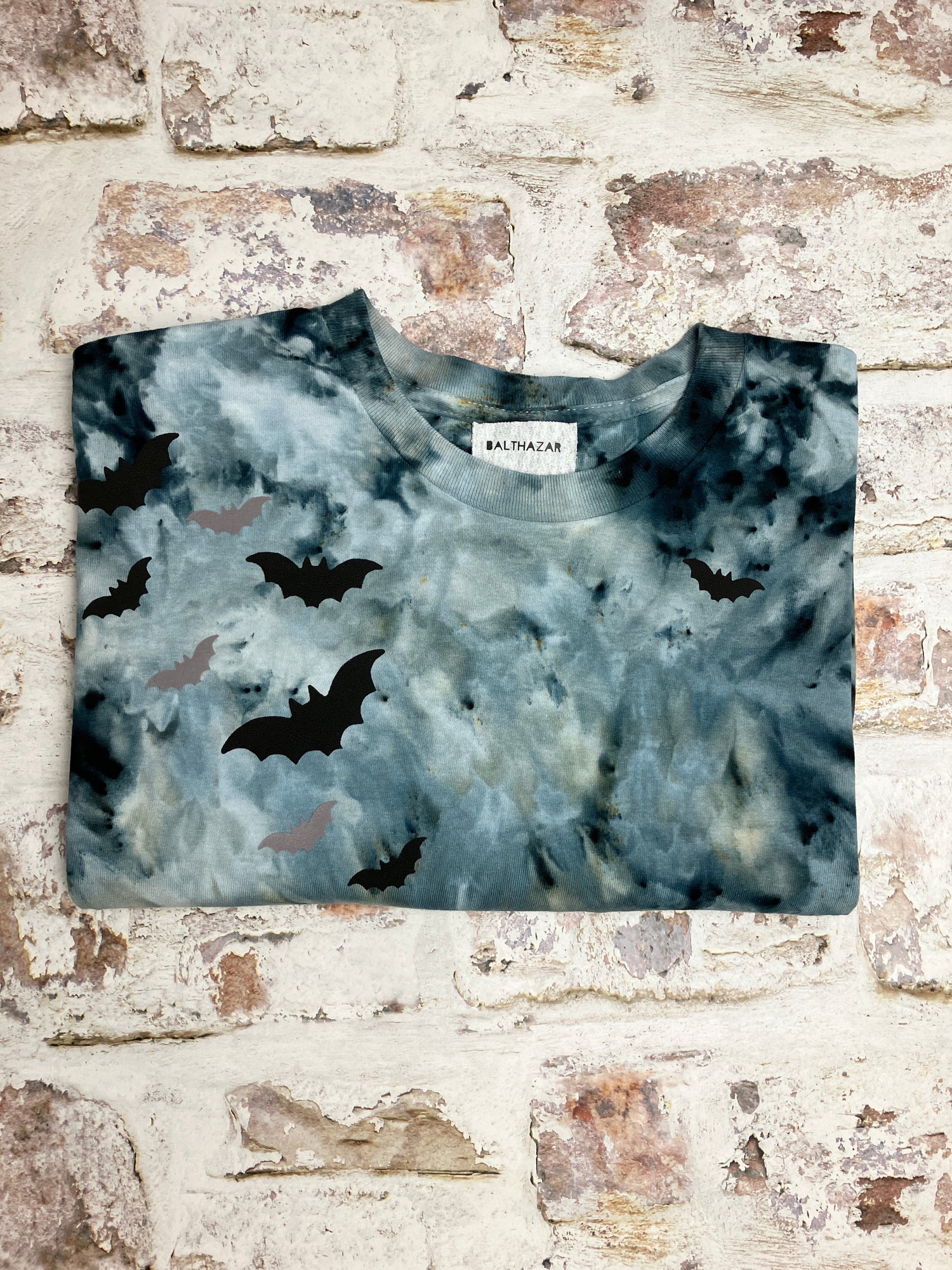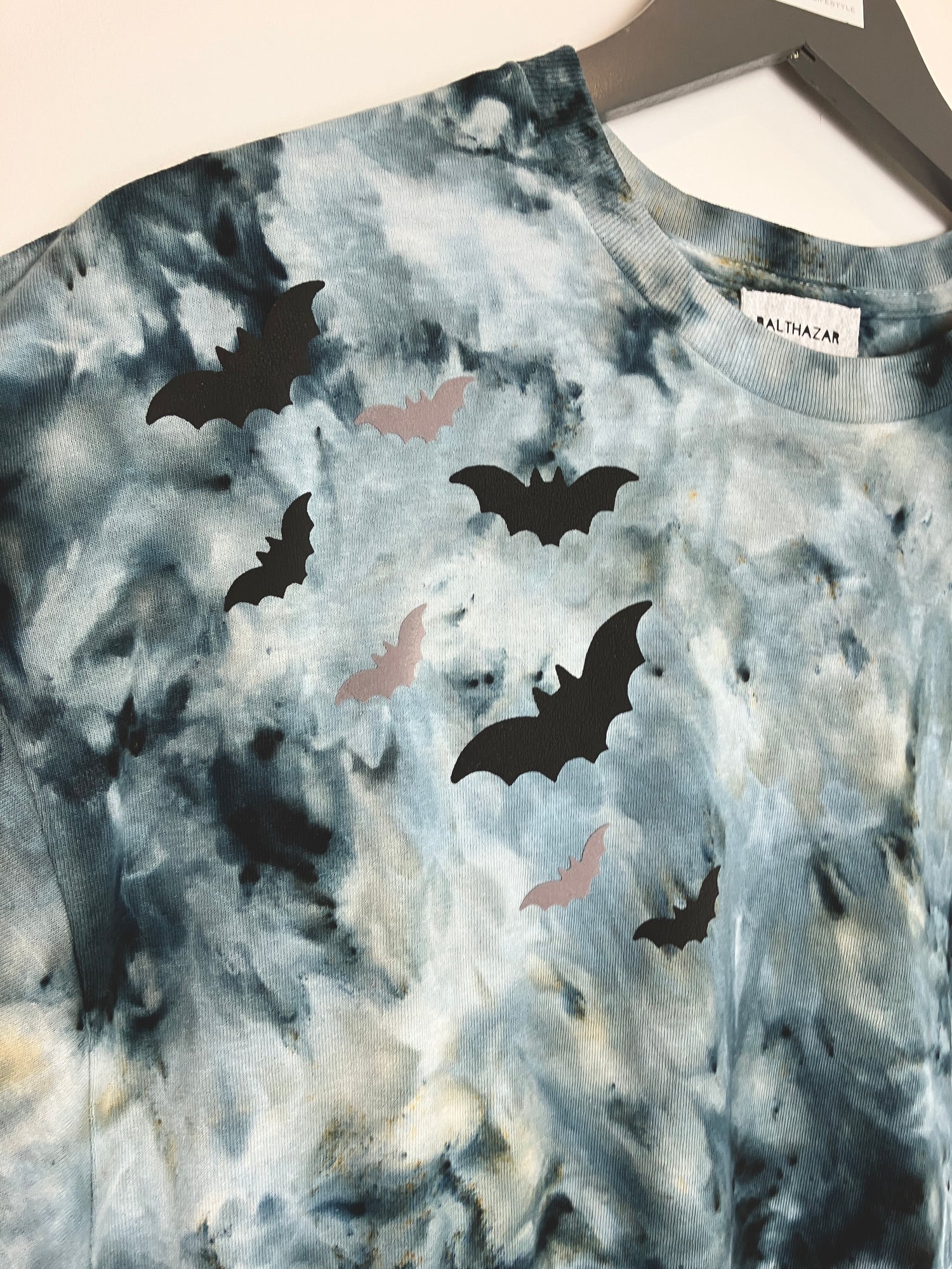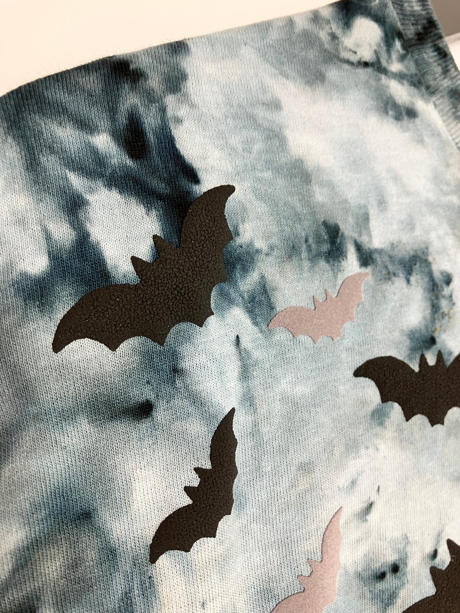 and a spray of light grey flocked bats and black puff vinyl to add textured to the design: You can see varying shades of grey and black with hints of blue or purple ( these are colours within the dye but the dominant colours are smoky grey and black)