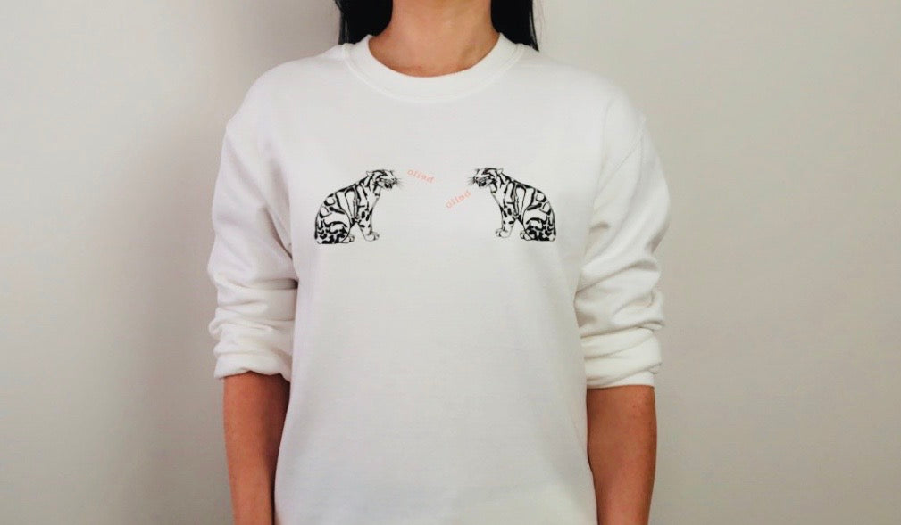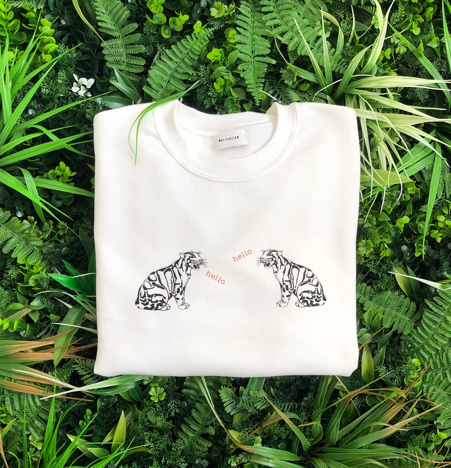 This awesome sweatshirt features two of our hand drawn leopards, cut from matt black or matt white vinyl ( each leopard measures just over 3.6 inches in width and 3 inches in height) and each leopard has a vibrant orange "hello"