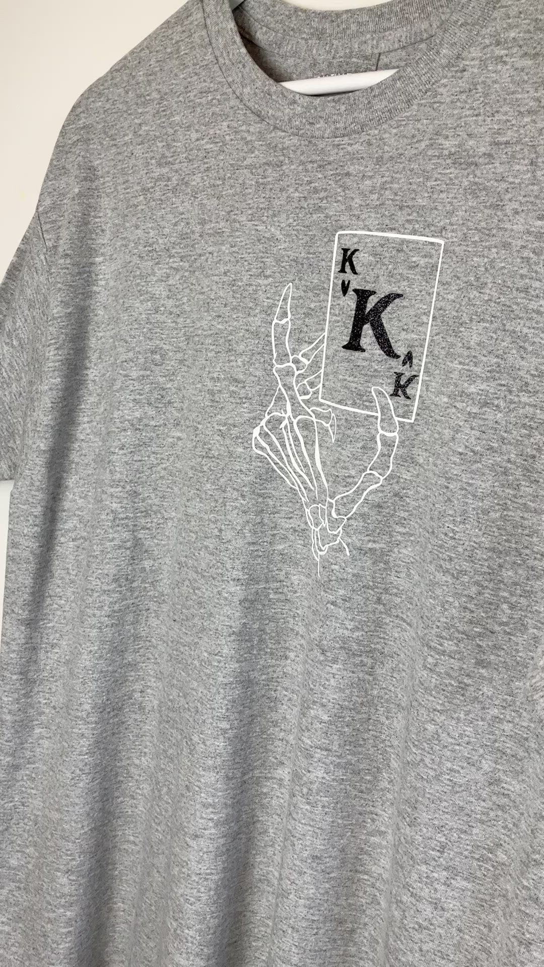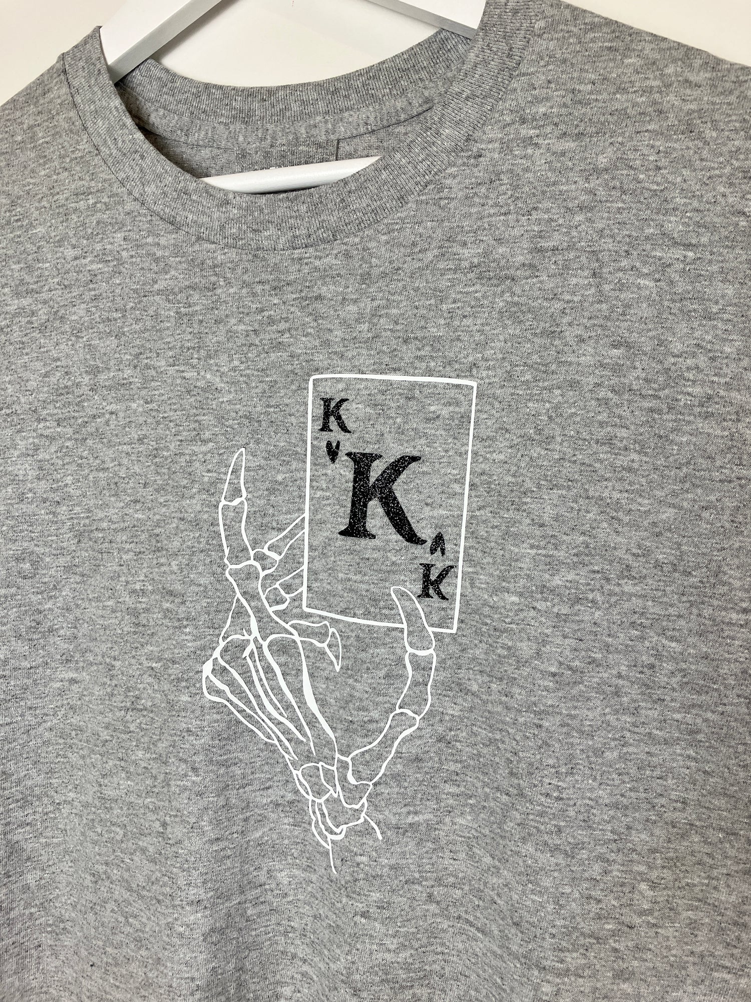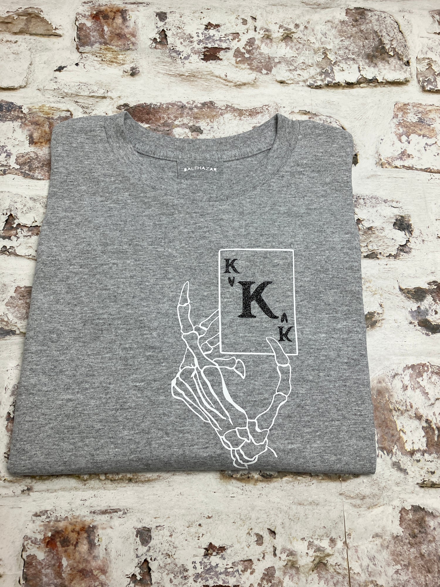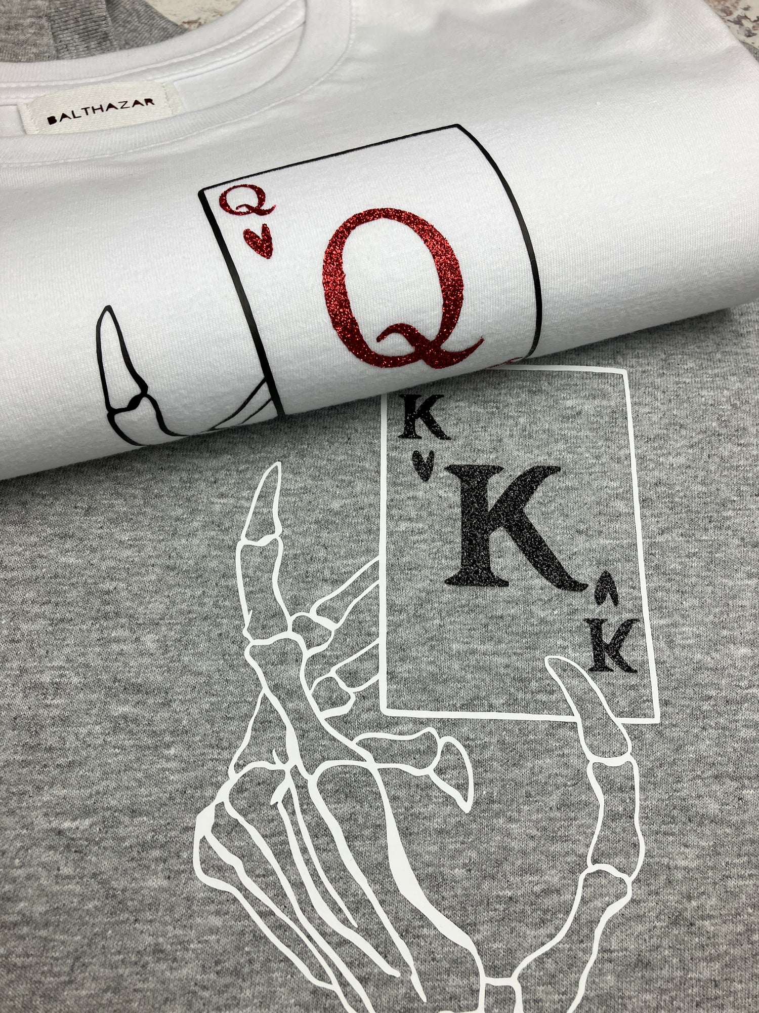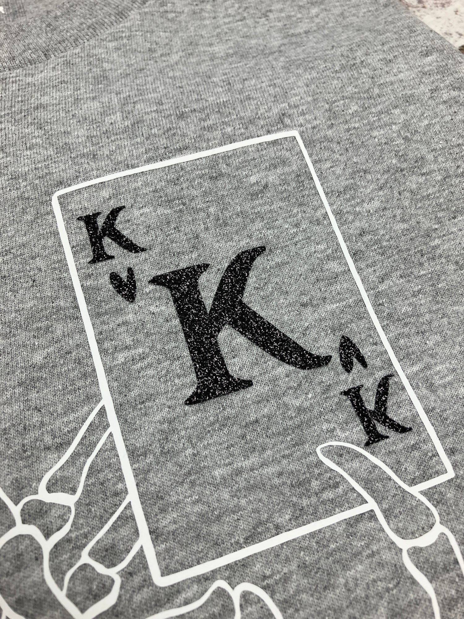 Our hand drawn skeleton hand holding a playing card with King of hearts cut from stunning black glitter ( The glitter Q and hearts can be customised to any other colour if you want, default colour will be a matt hand and black glitter Q's)