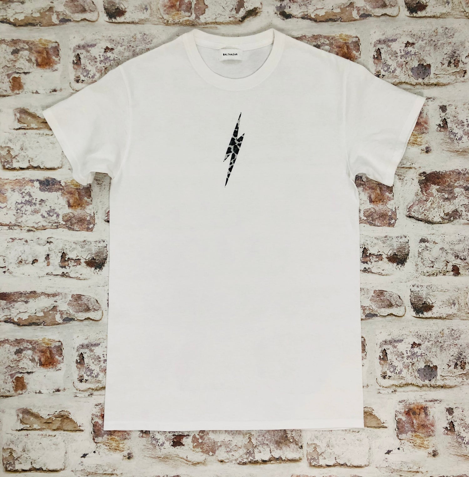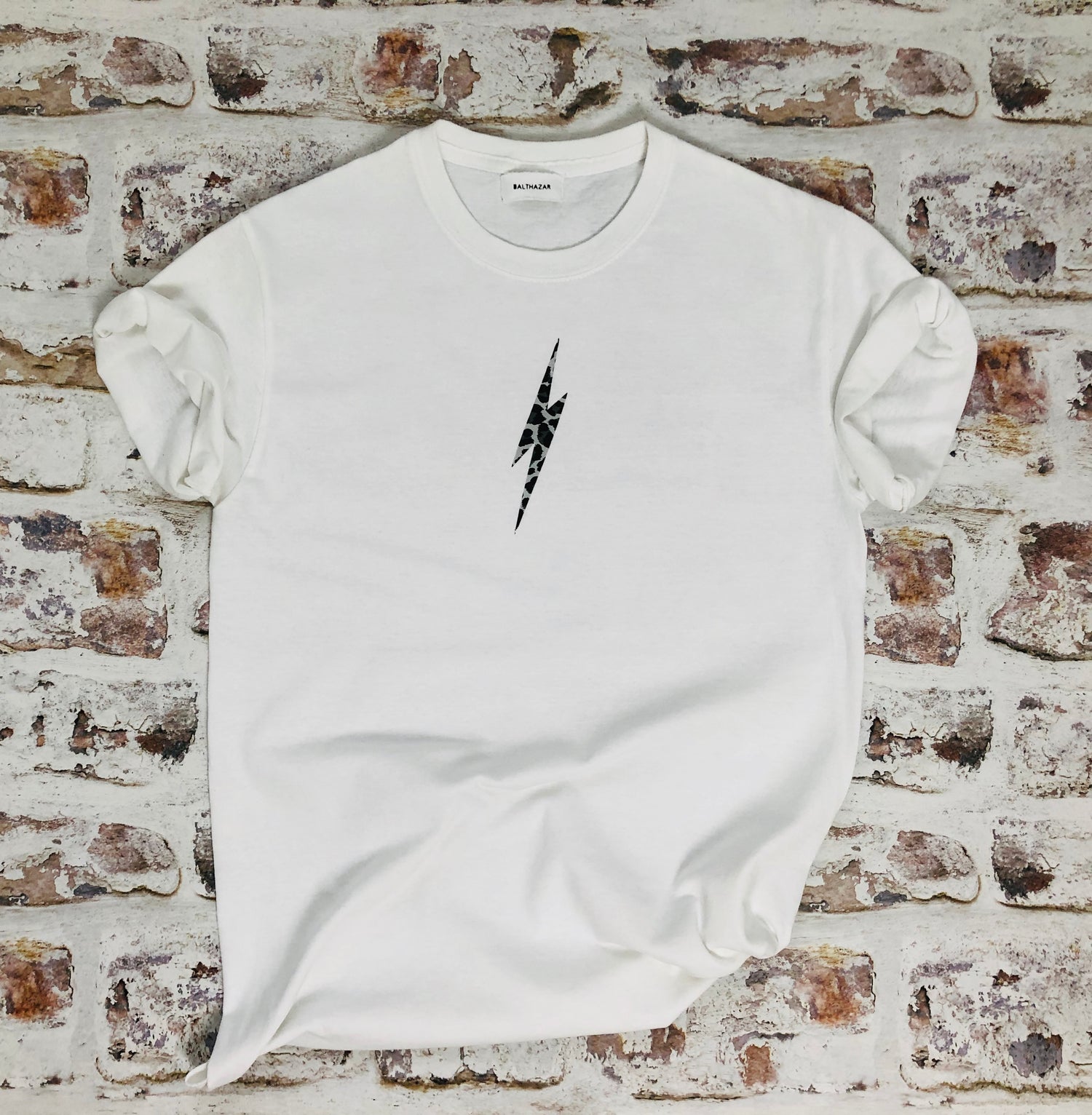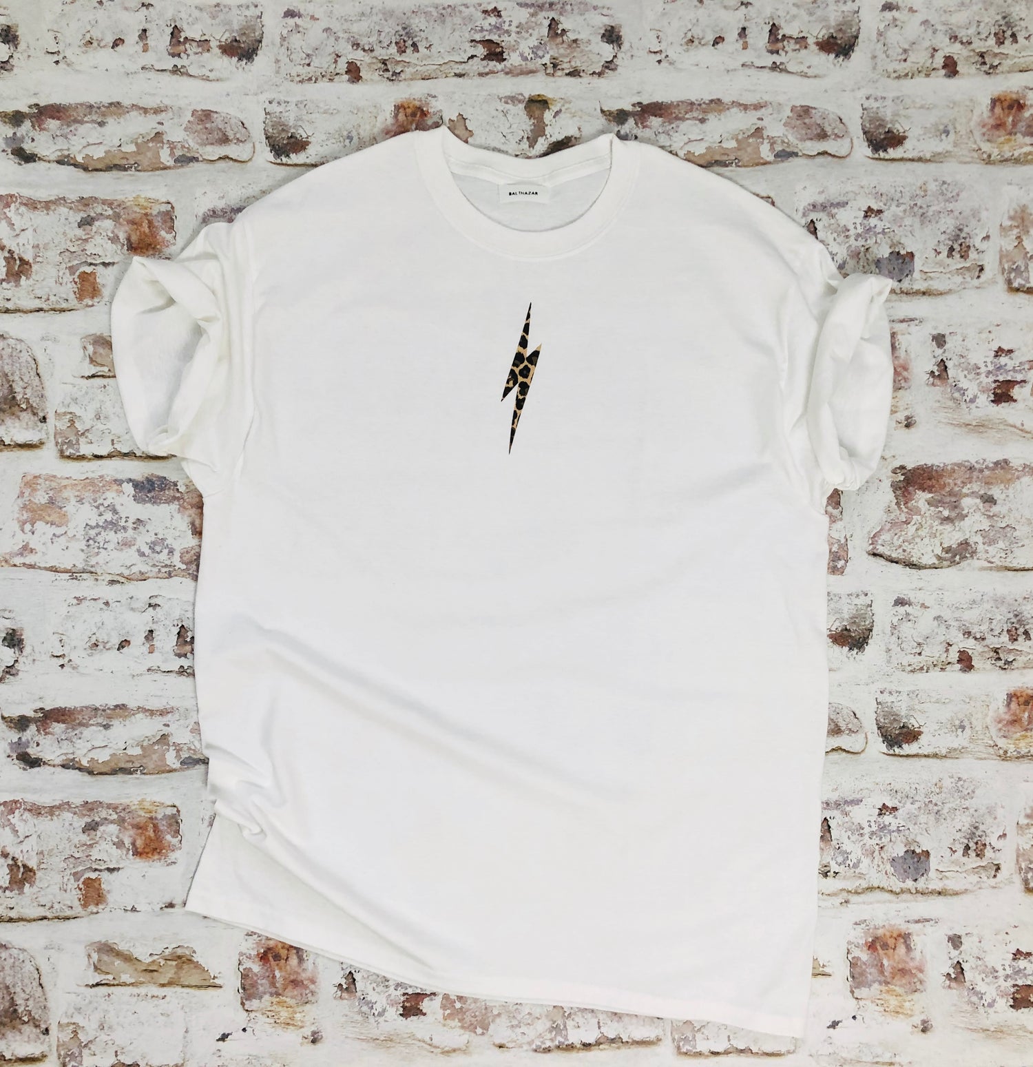 The Animal print lightning bolt t-shirt features a lightning bolt cut from either Cheetah ( Gold and black), Leopard ( Black and Silver) or Pink leopard vinyl and measures just over 5.6 inches in height.