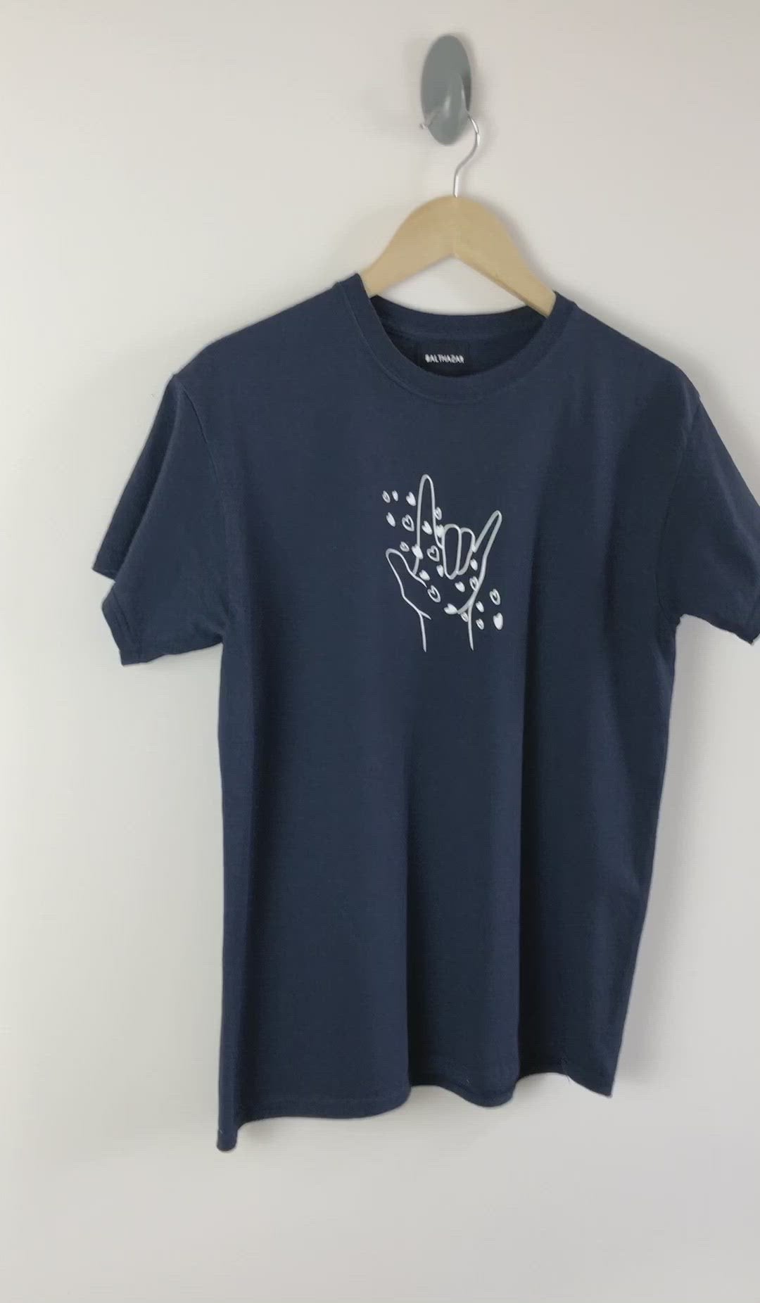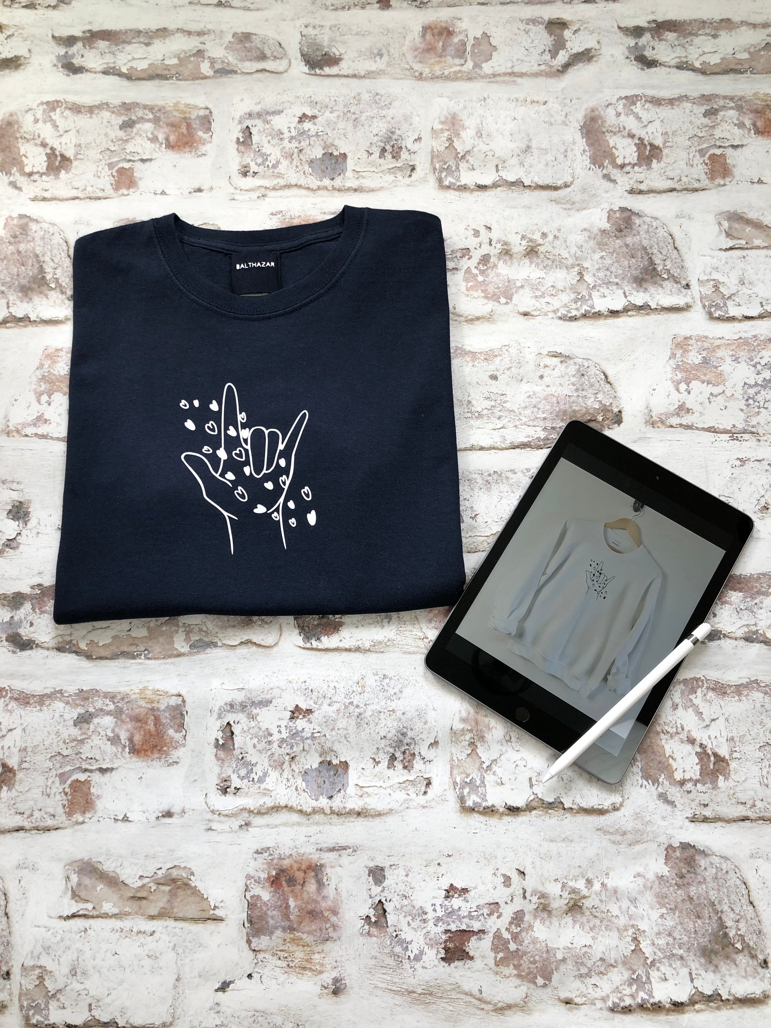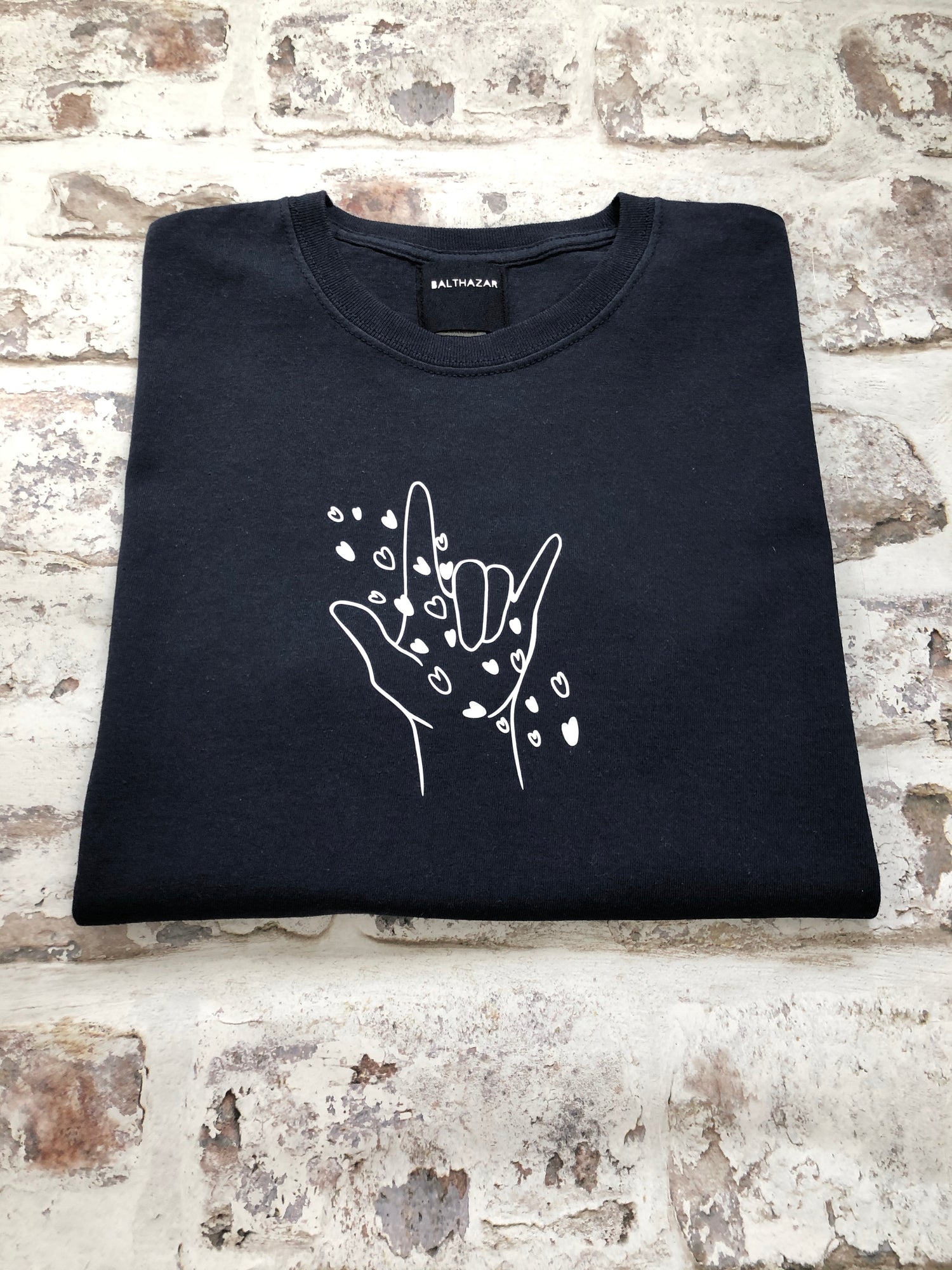 The Love and hearts sign language t-shirt featuring a hand drawn Love sign with abstract hearts, each hand measures just over 6 inches in height and just under 4.5 inches in width