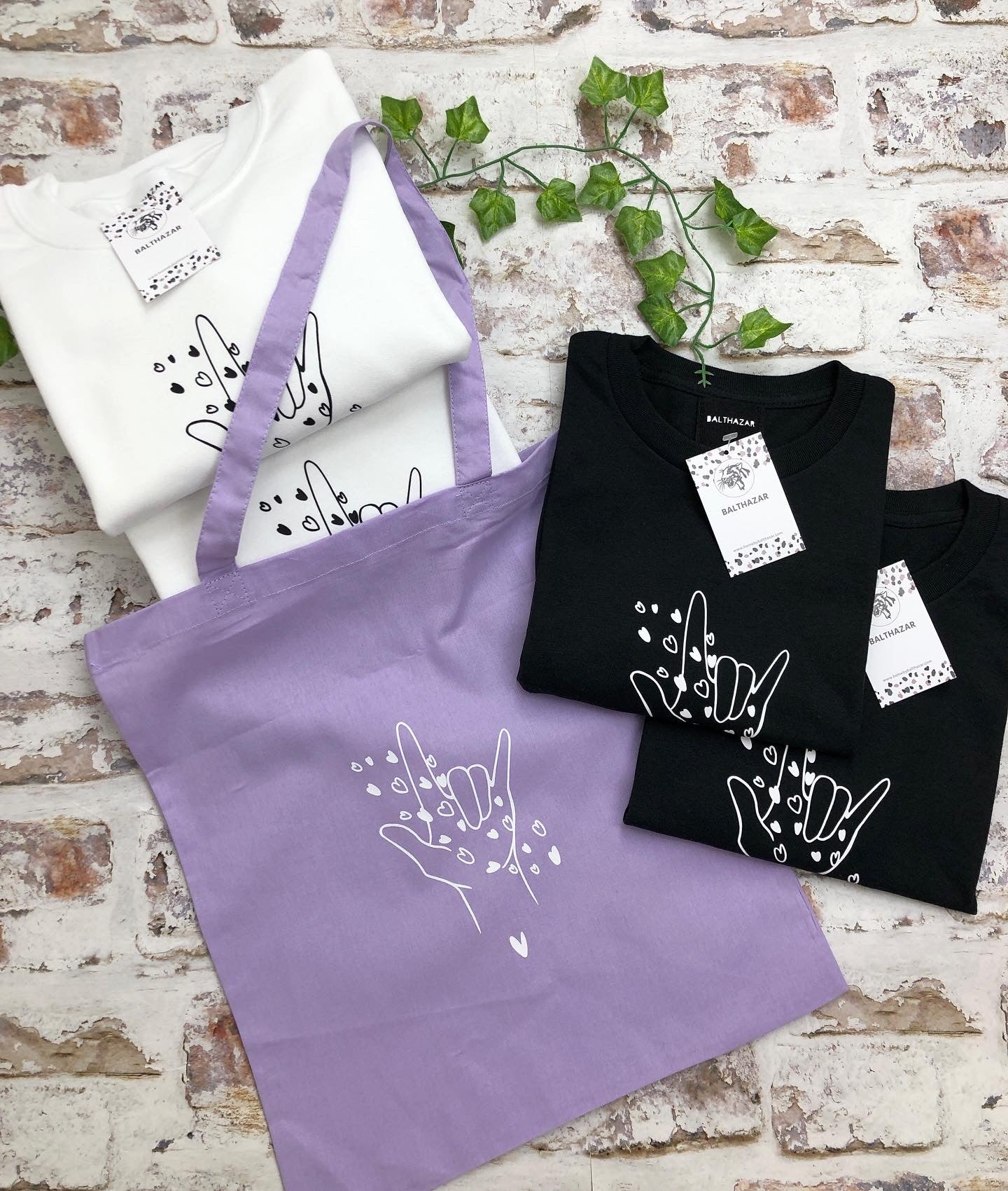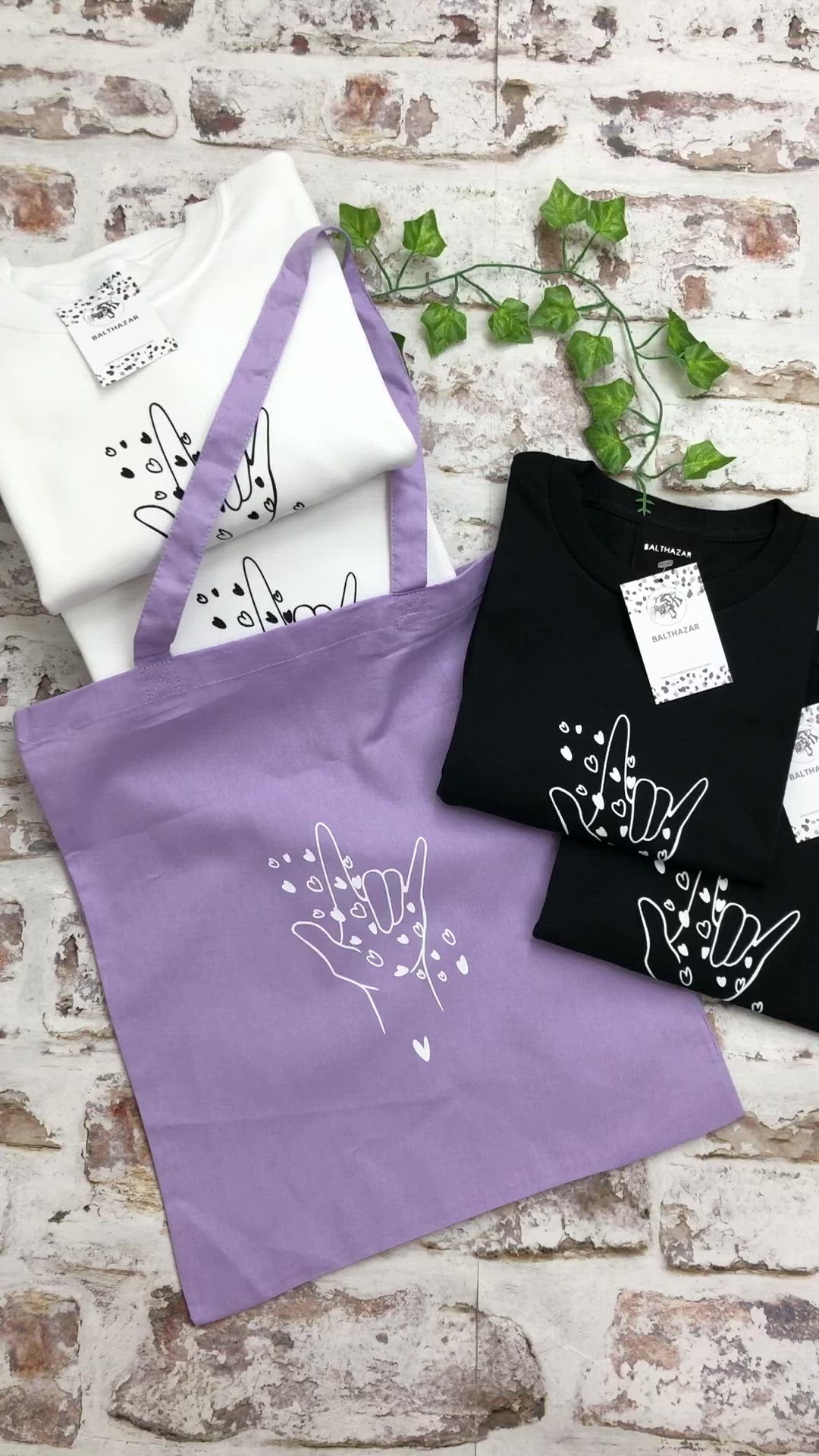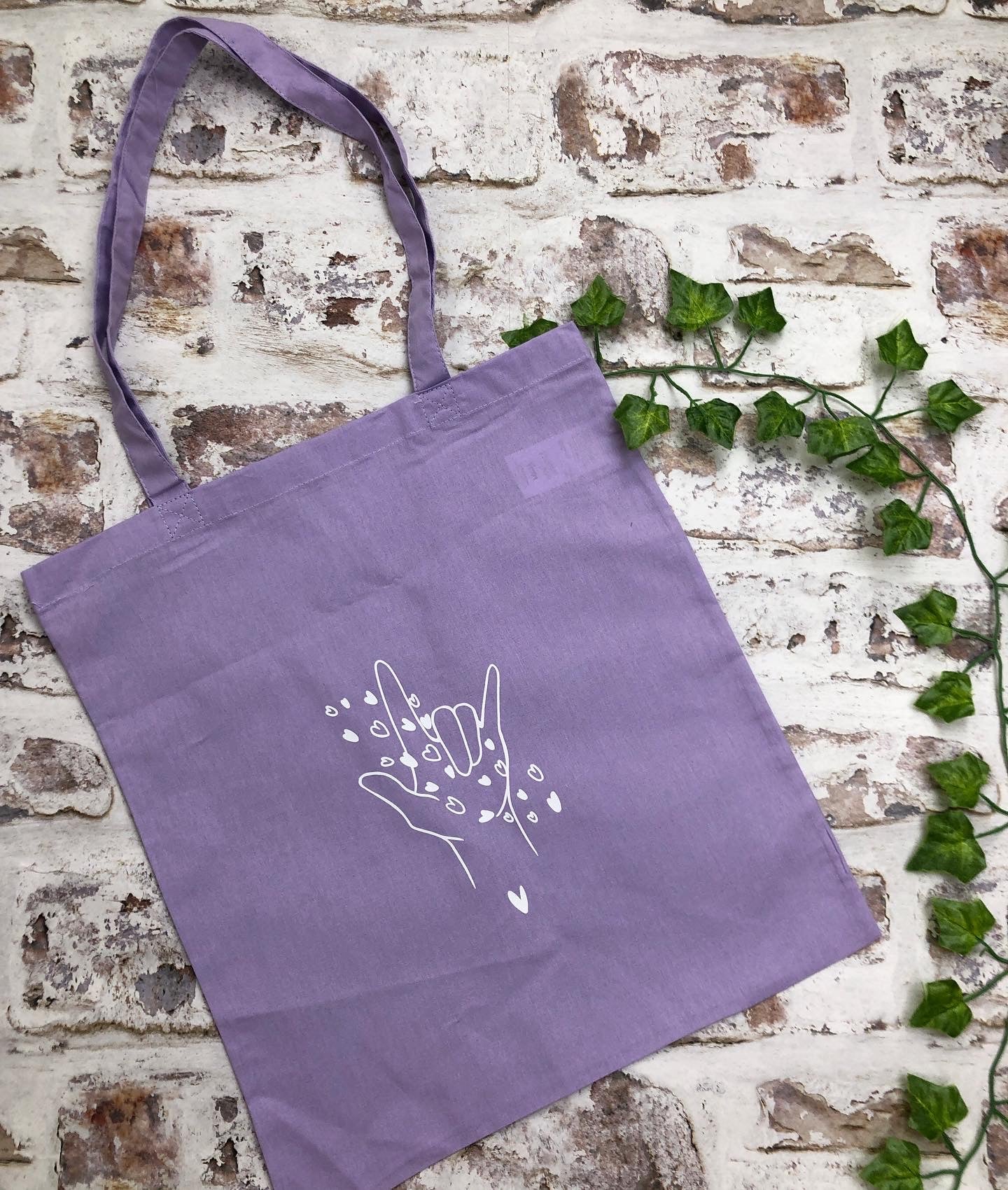 Cotton tote bag featuring our hand drawn hand showing the sign language symbol for LOVE and with hand drawn abstract love hearts