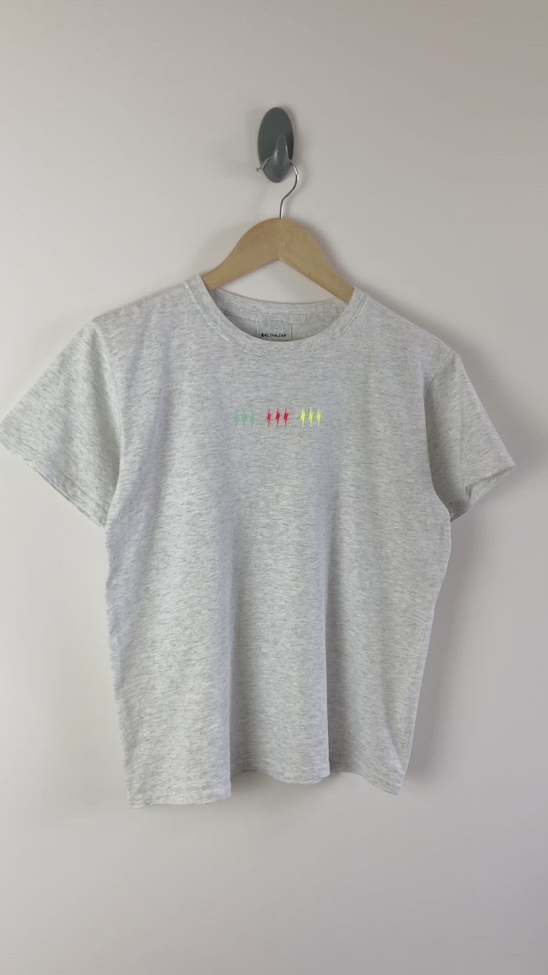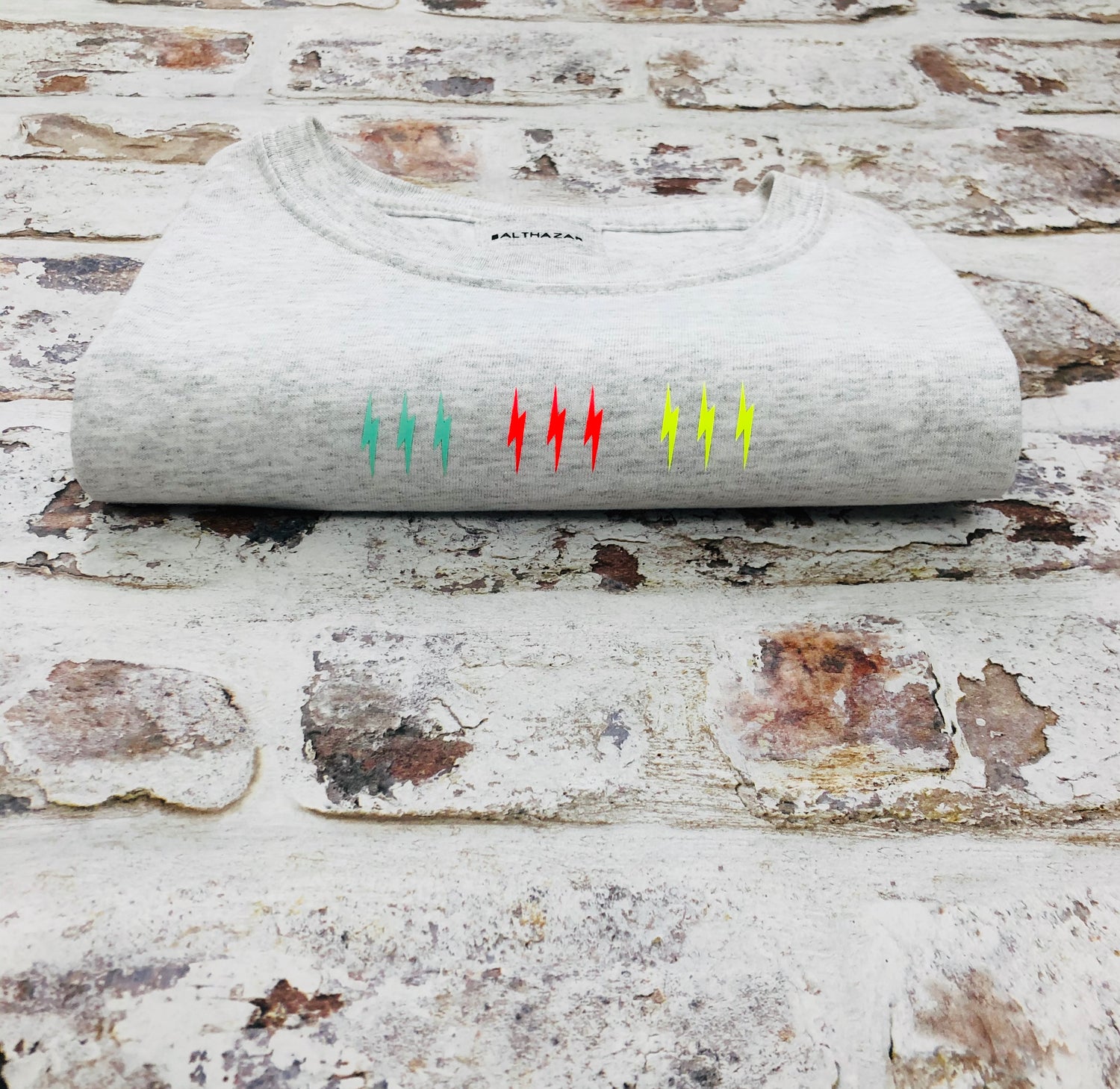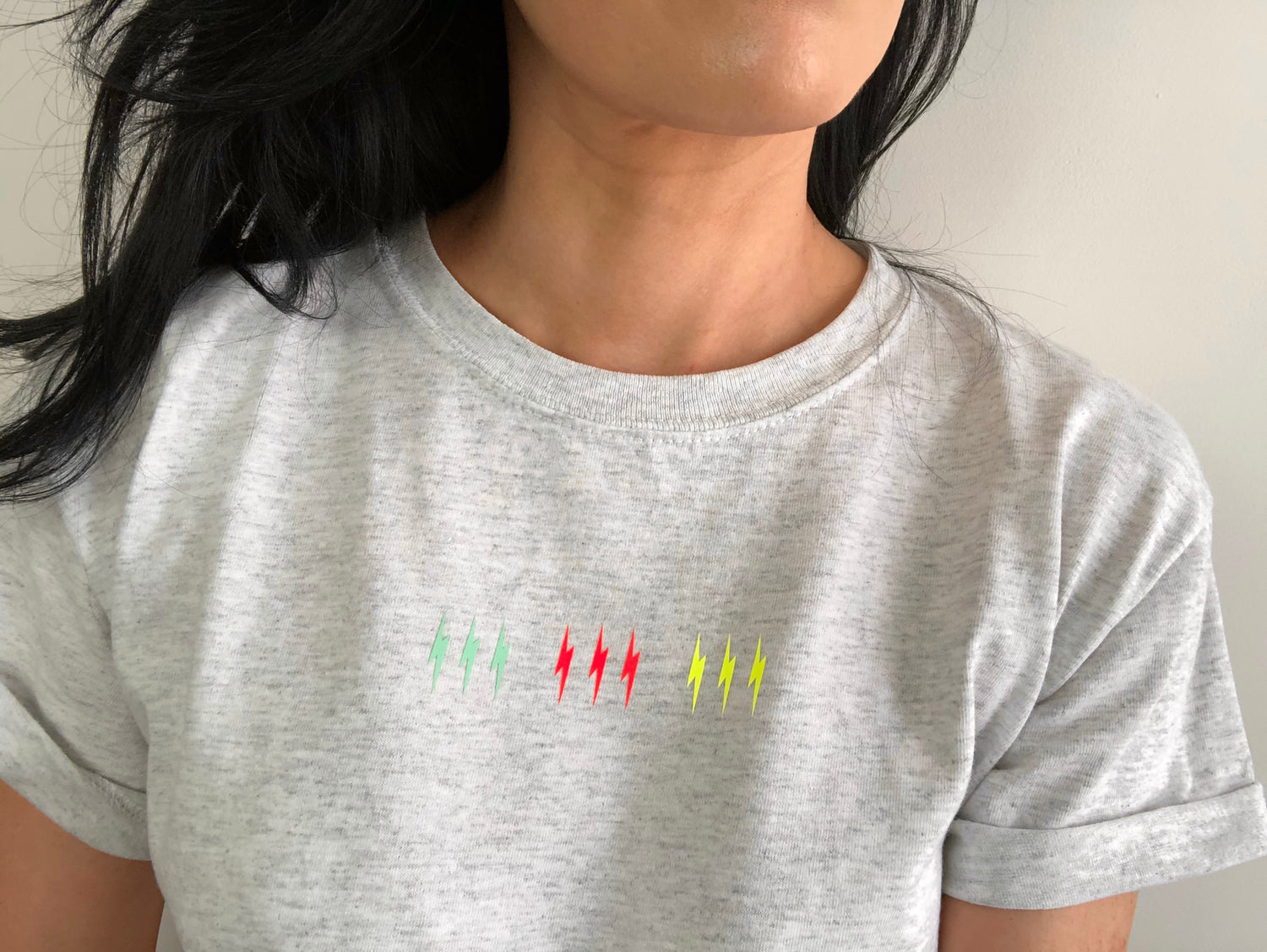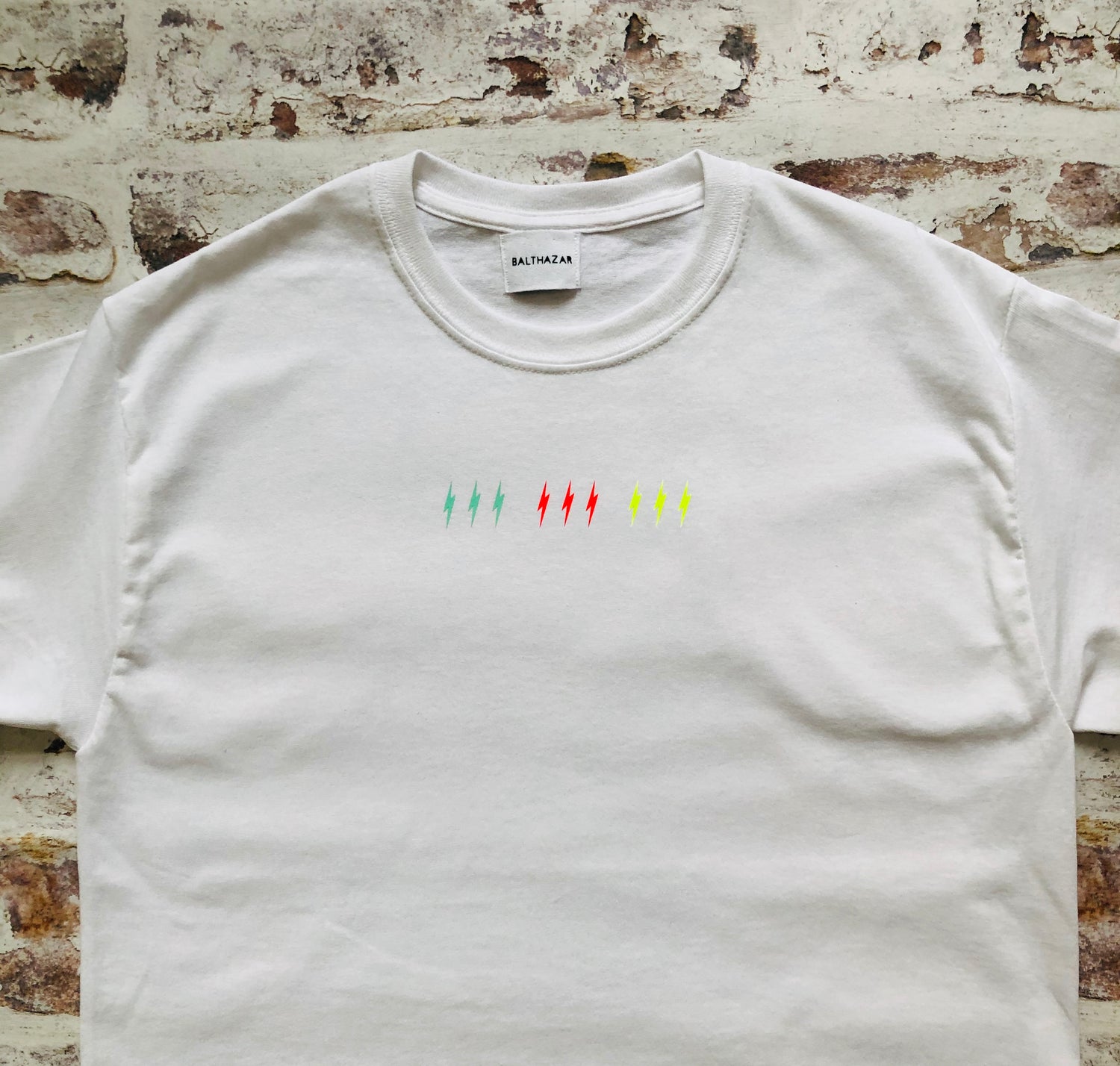 The lightning bolt t-shirt features three new vinyl colours: Mint, Neon red and Neon Yellow, each lightning bolt measures 1 inch in height and each colour block measures 1 inch.
