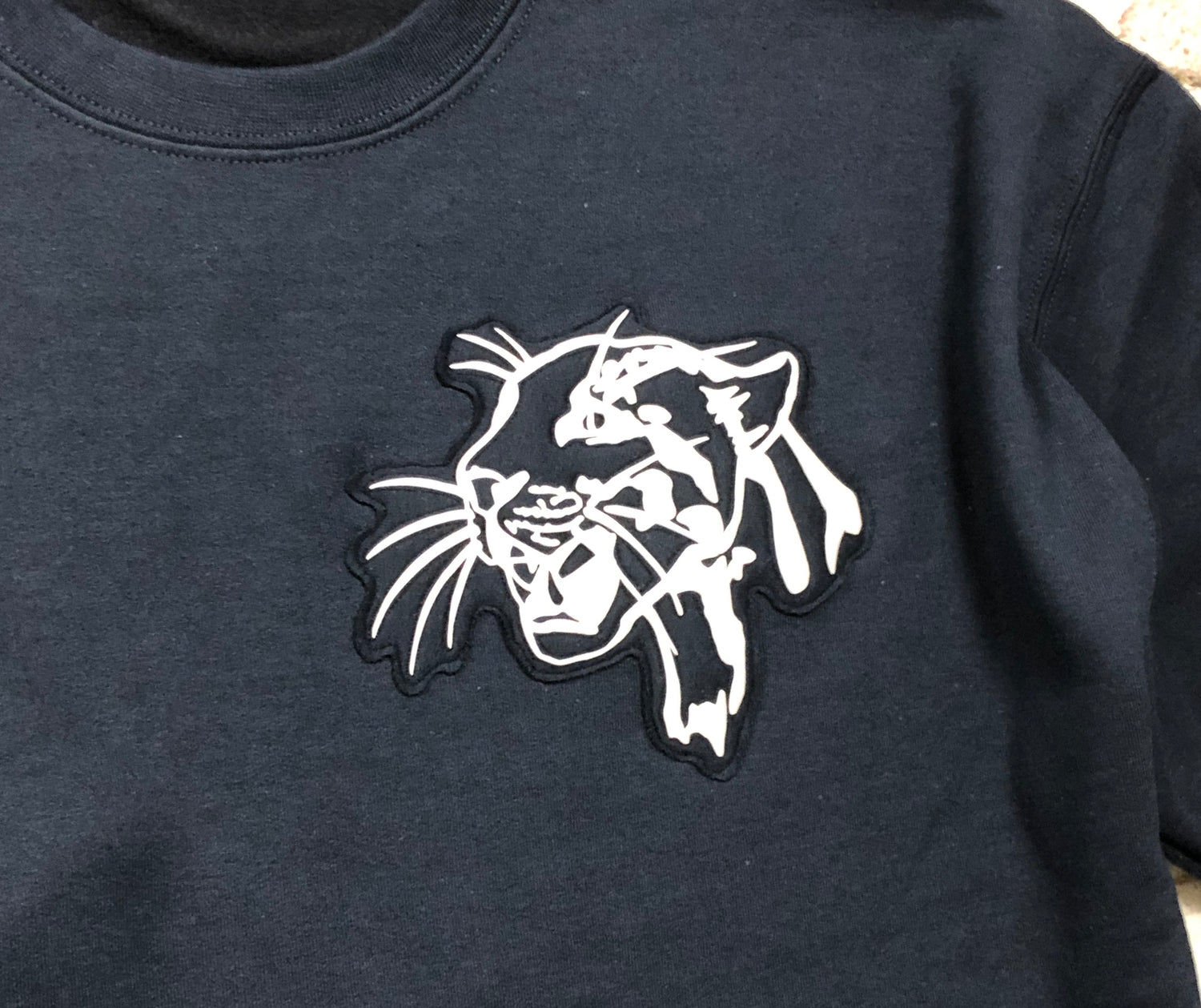 Leopard Head Sweater features a hand drawn Leopard, cut from high quality Vinyl which has been padded and detailing brought out by free hand embroidery as one piece and then embroidered to the sweatshirt.
