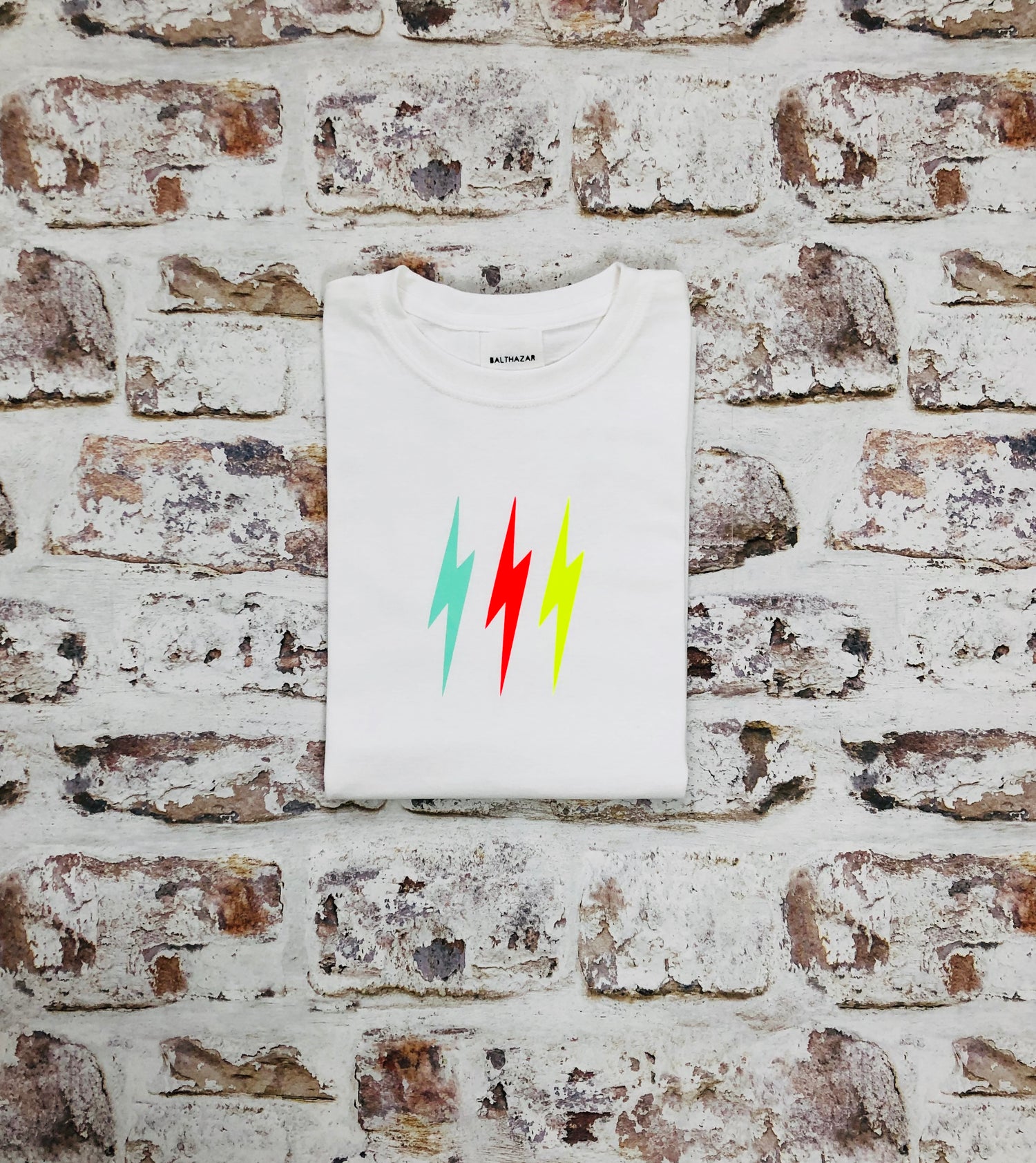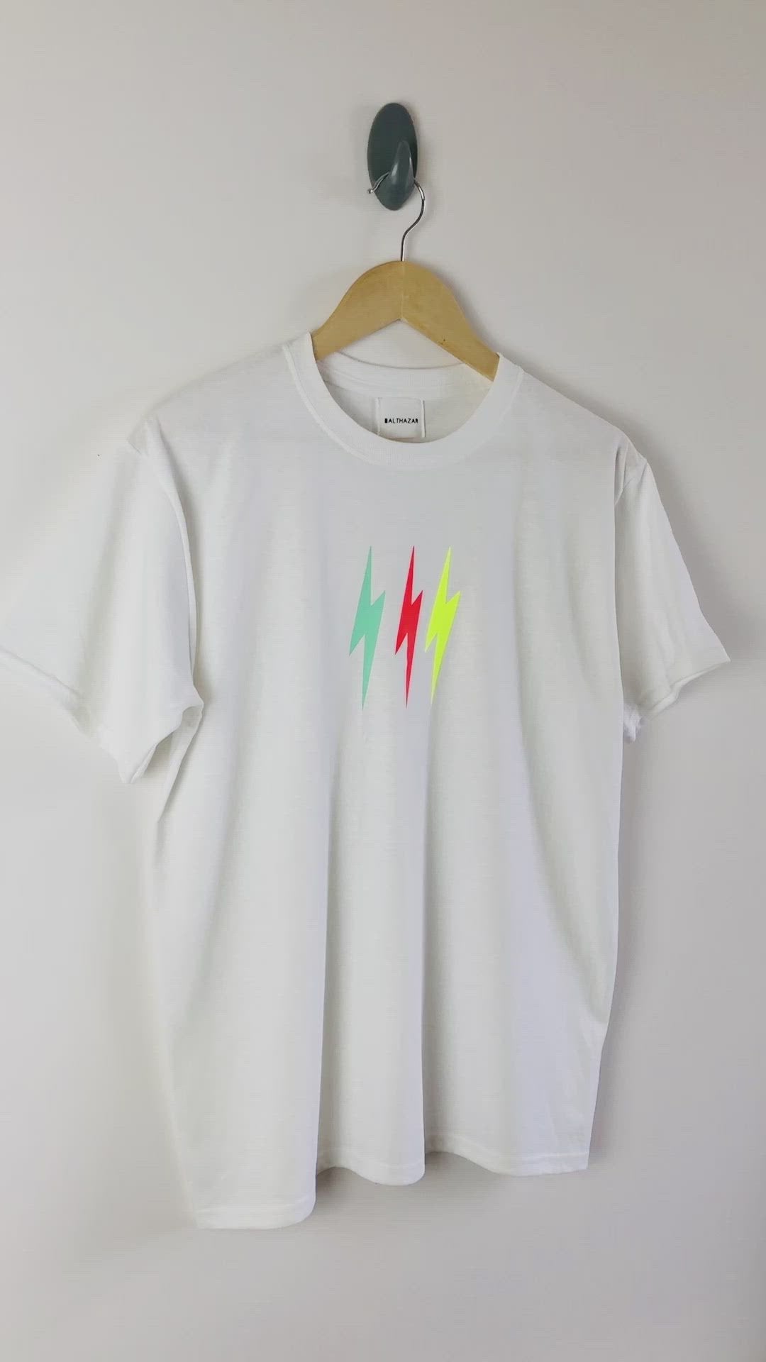 The Neon t-shirt featuring three new vinyl colours: Mint, Neon red and Neon Yellow, each lightning bolt measures just over 5.6 inches in height.