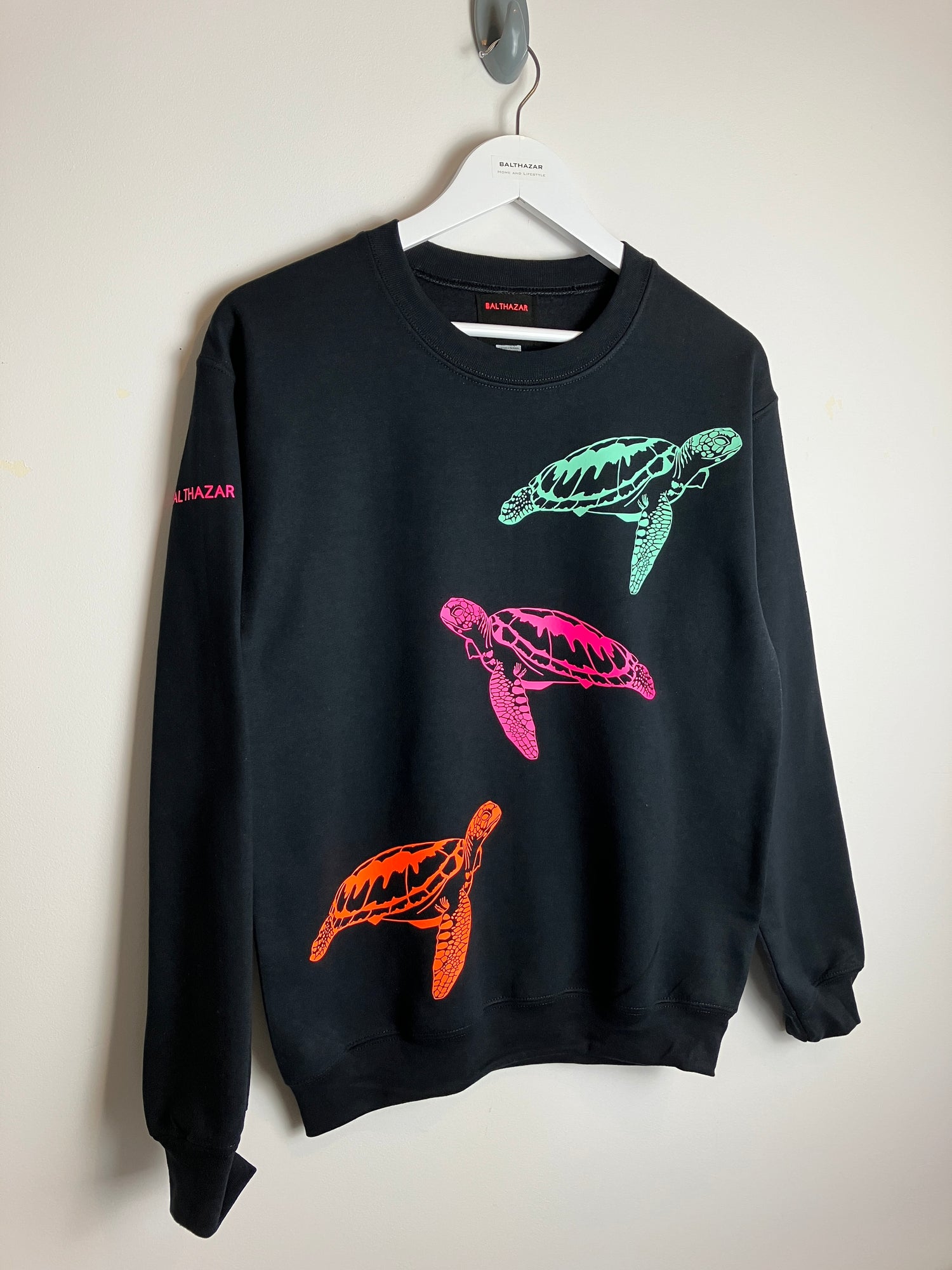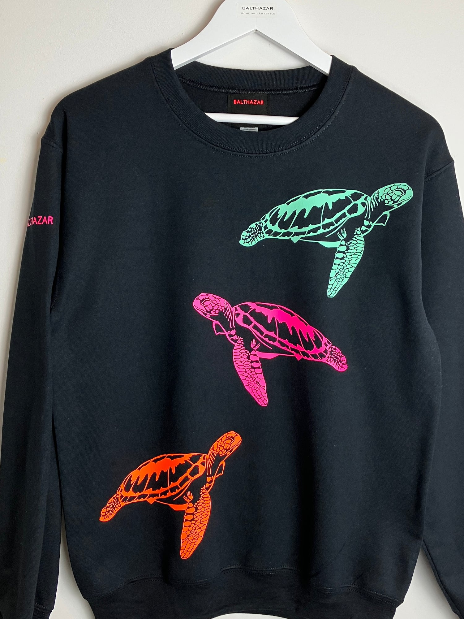 Talk about a statement sweatshirt! The hand made Neon turtle sweatshirt features three hand drawn turtles each measuring 8 Inches in width and cut from high quality neon orange, mint and neon pink vinyl