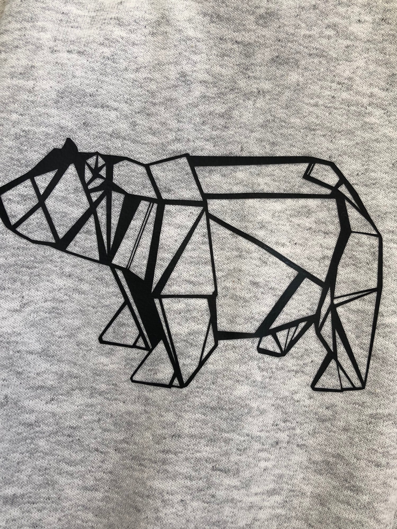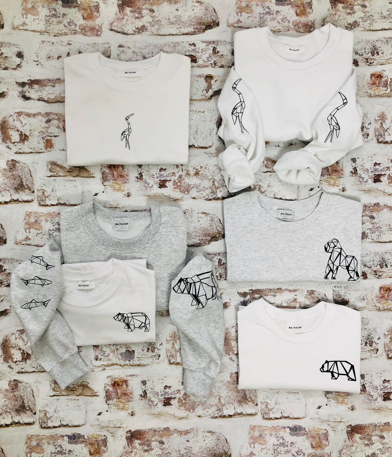 The unisex sweatshirt features a hand drawn bear and salmon in the Origami style designed in-house and cut out of your choice of Vinyl.