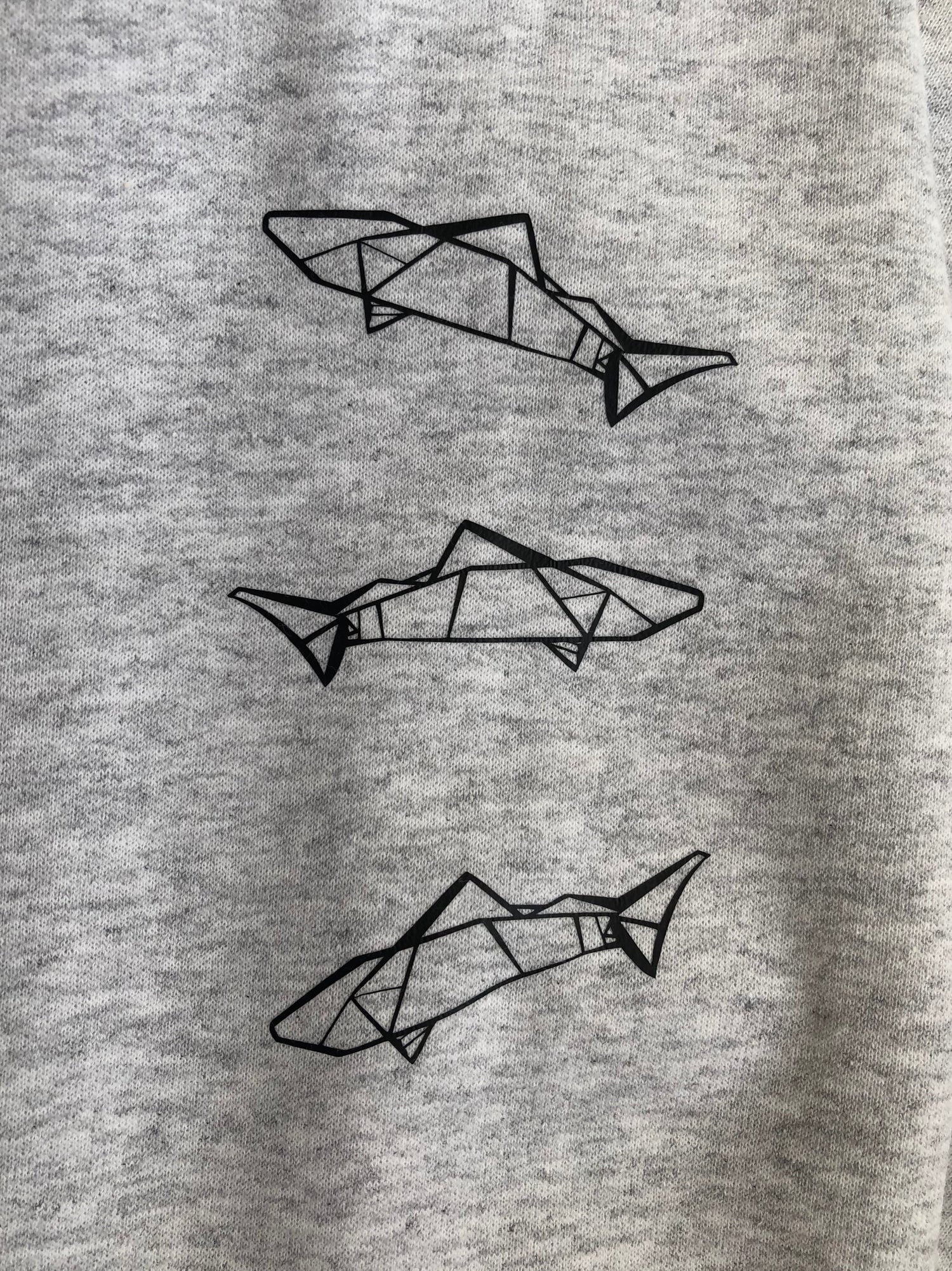 The design featured on the sleeves: The left arm has the bear looking to the right, where the right arm has three origami style salmon swimming.