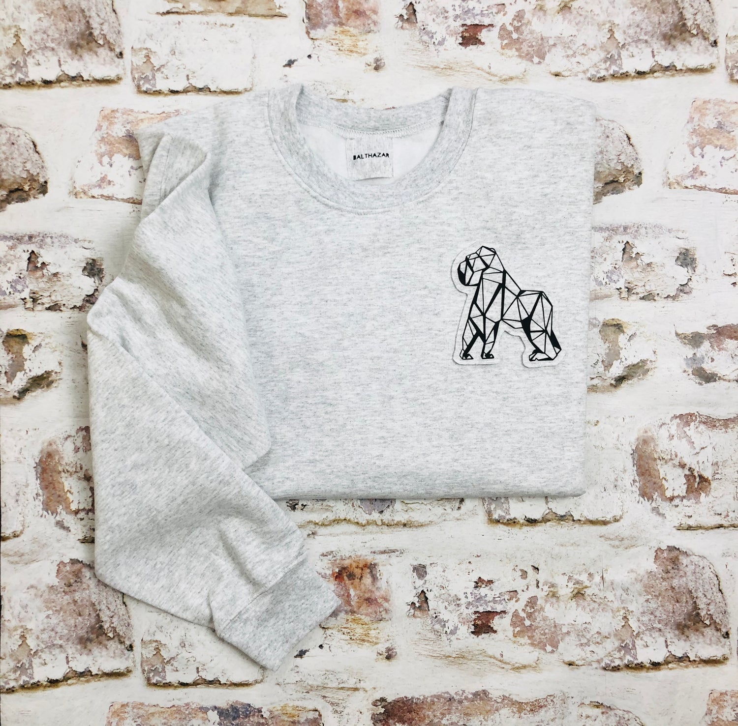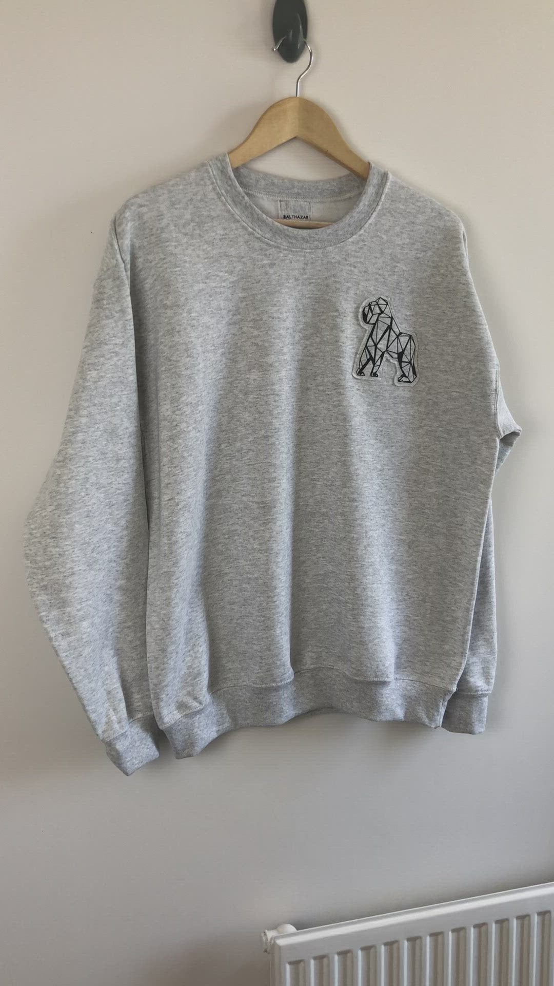 Our soft cotton sweatshirt features a hand drawn Origami style Gorilla measuring 4 inches by 3.5 designed in-house and cut from high quality vinyl, which has been stitched to soft wadding with elements stitched to bring our a soft tactile feel.