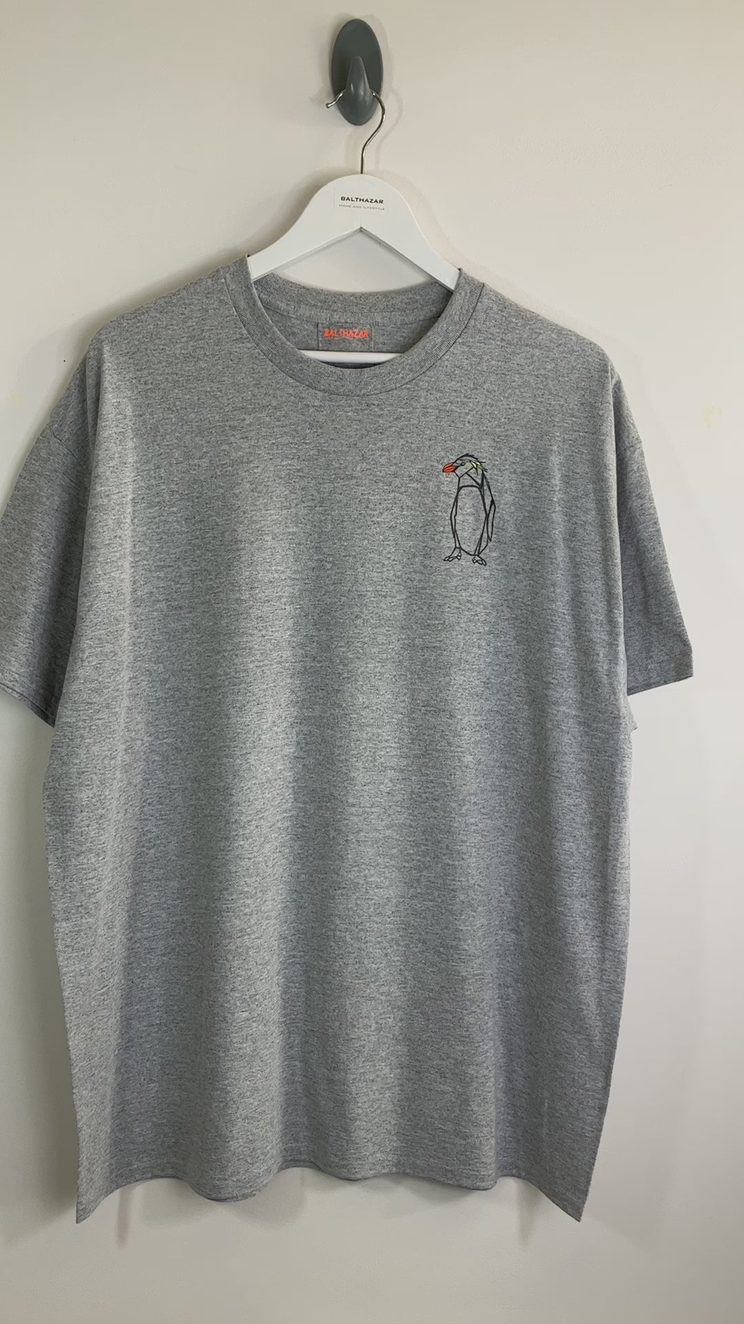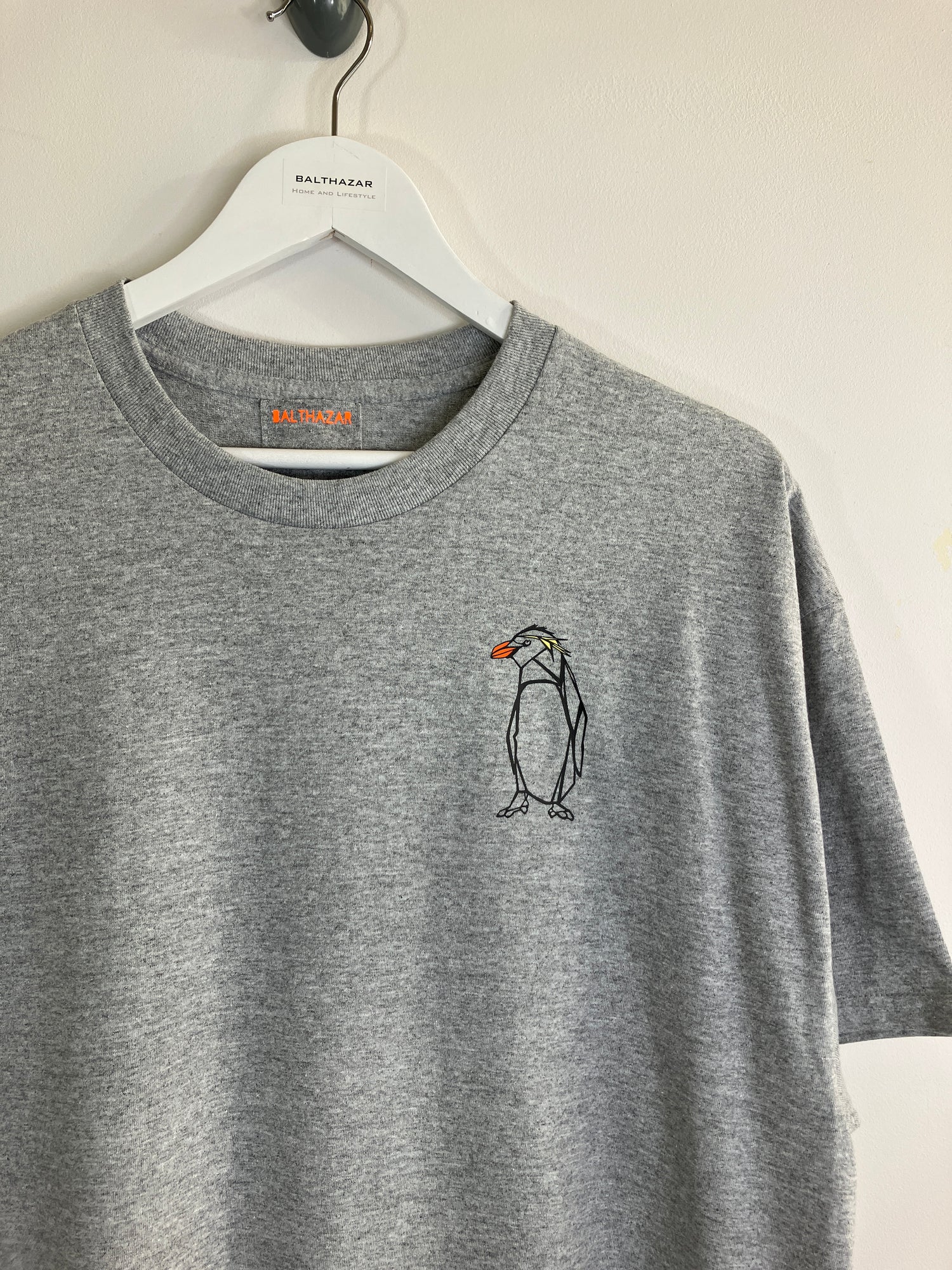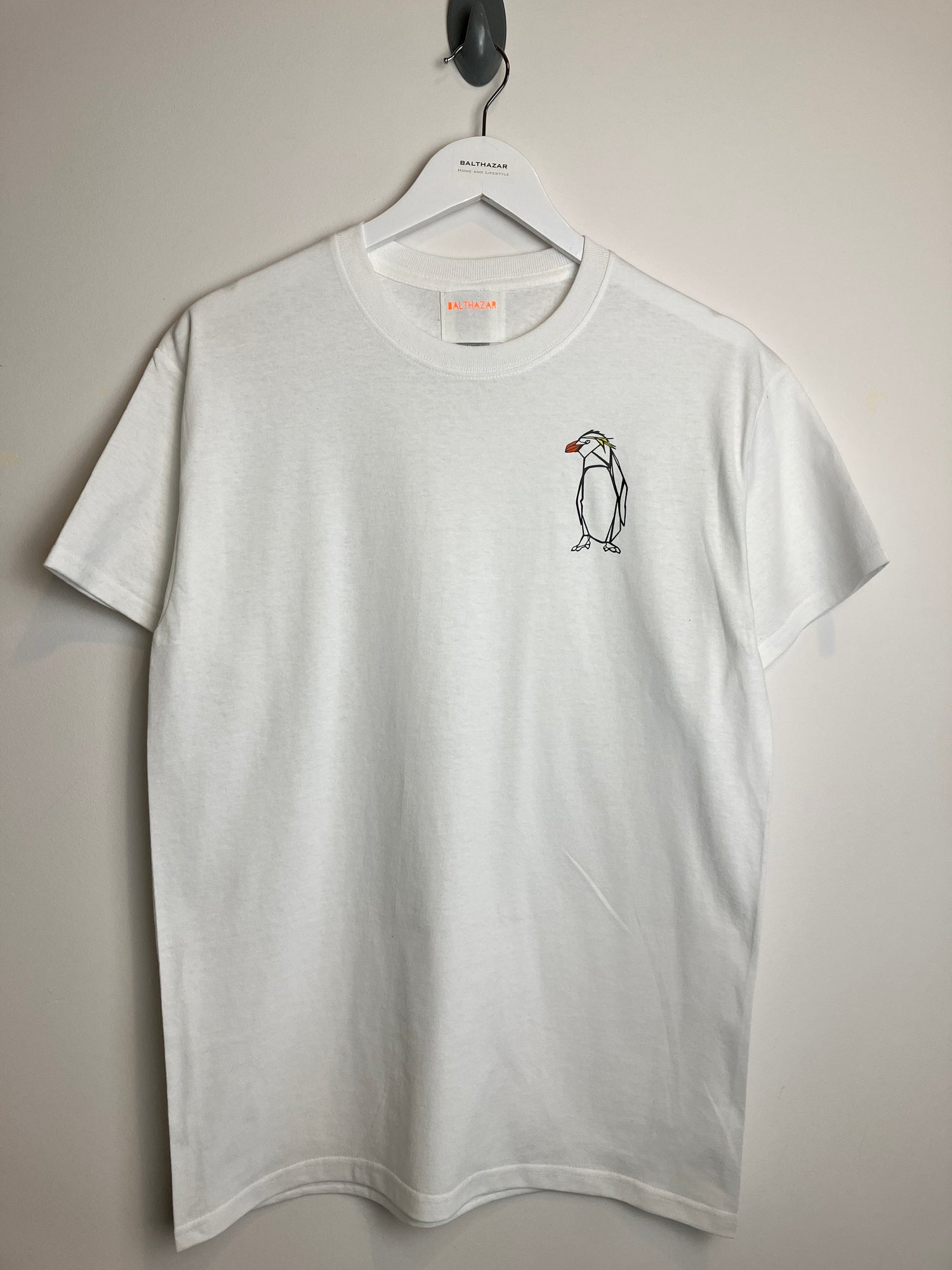 Short sleeved cotton t-shirt featuring a hand drawn Rock hopper penguin in an origami/ geometric style. with colourful elements of an orange beak and yellow feathers to mimic the Rock hopper penguin