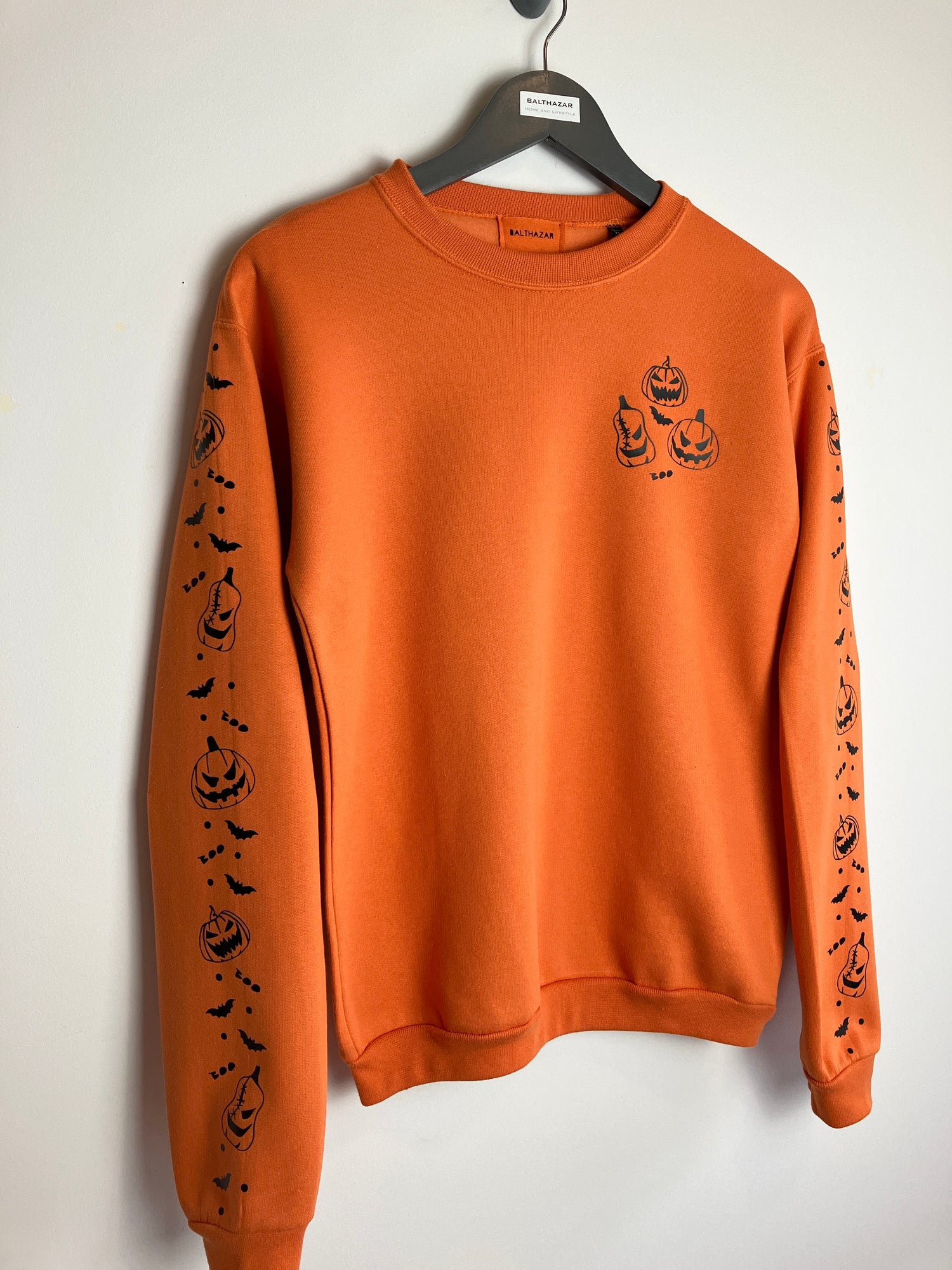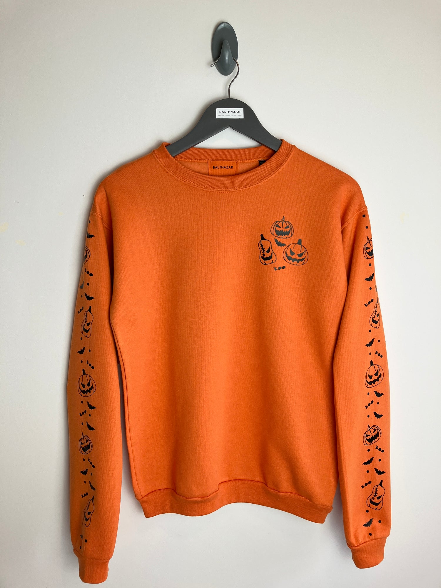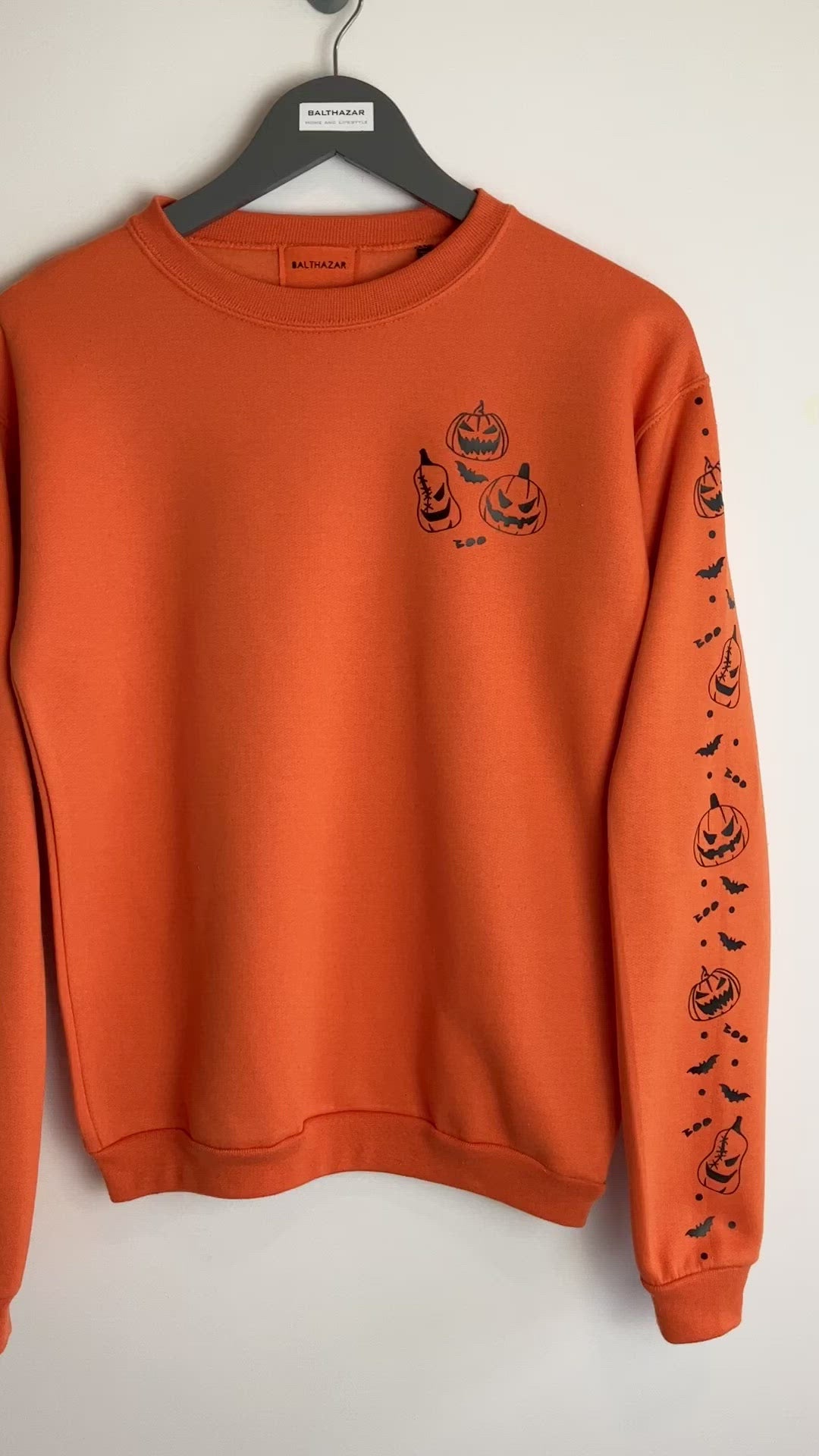 Our fan favourite pumpkins have been miniaturised to create a confetti style pattern with boos and bats down both sleeves with an additional cluster of the Pumpkins on the chest.