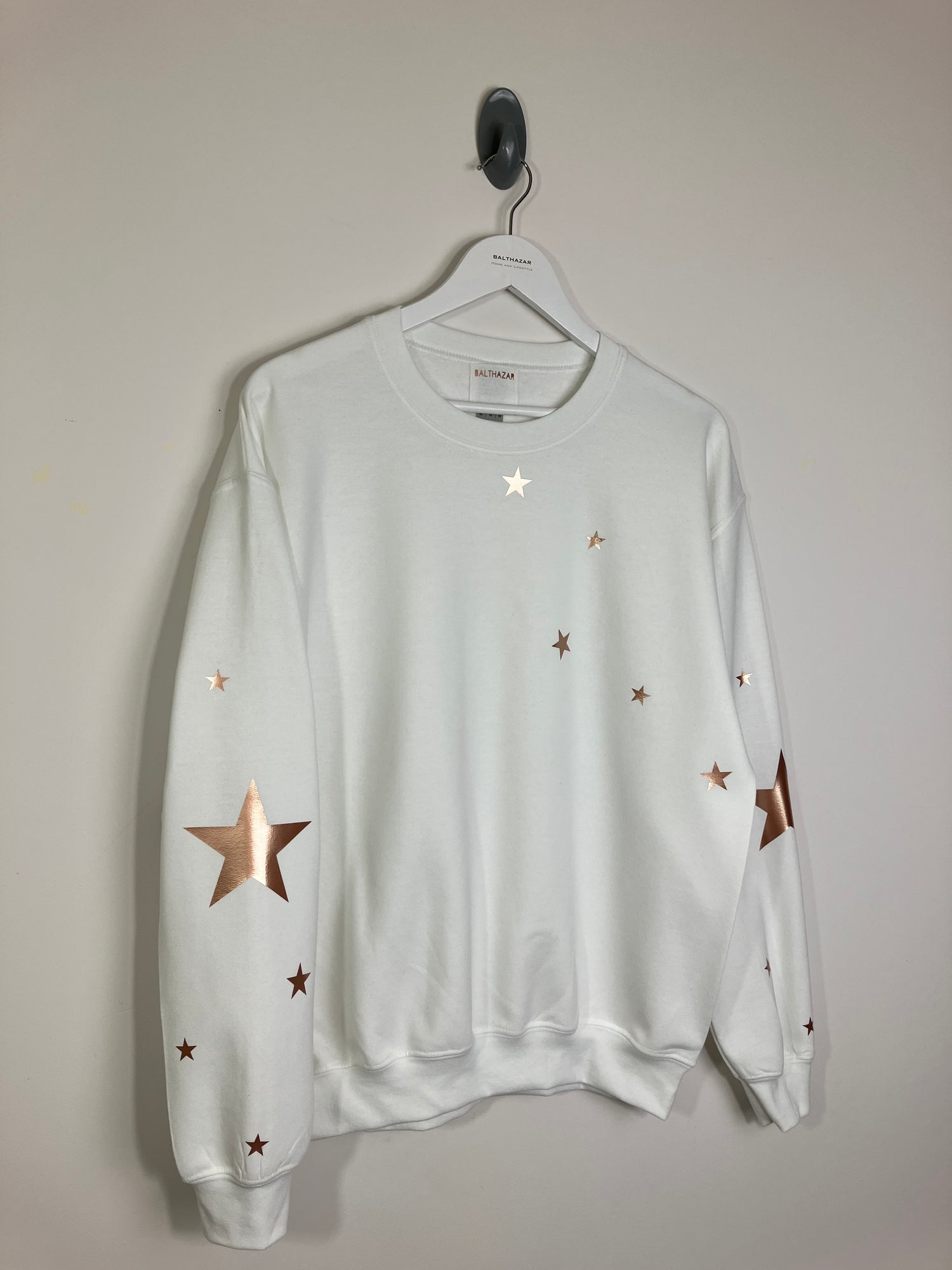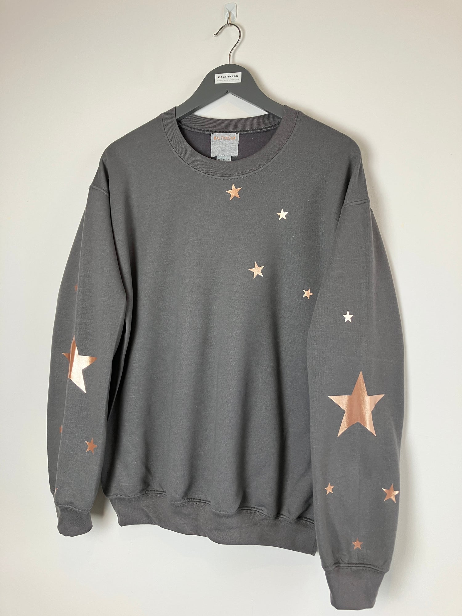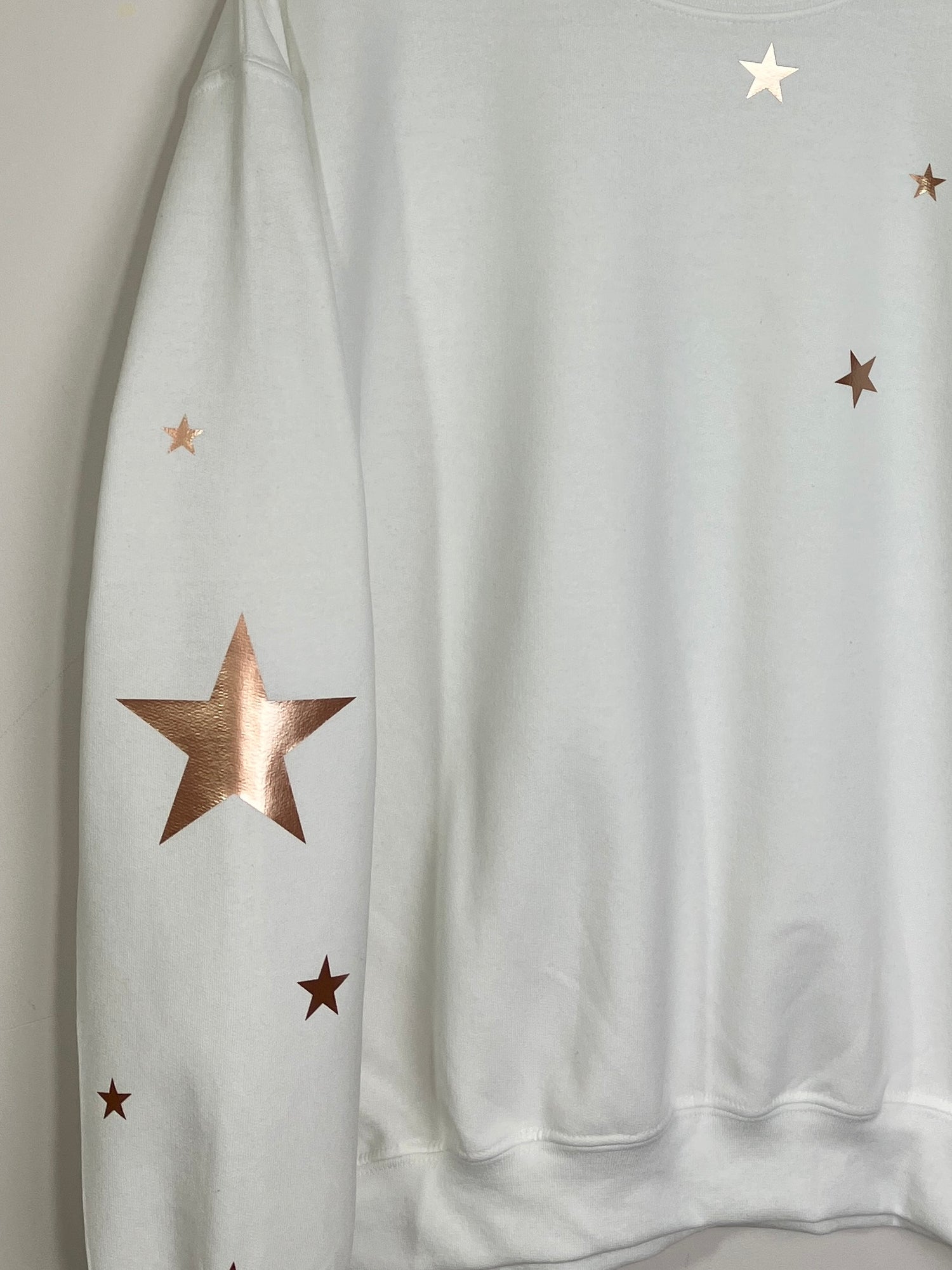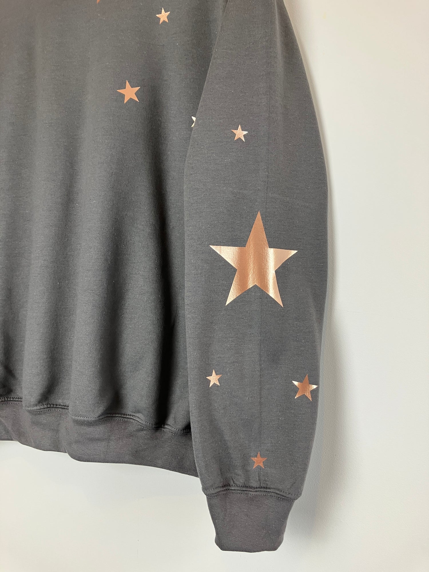 The sweatshirt features two large stars ( one of each arm) with smaller sized stars surrounding and going across the chest and a little star on the back of the collar