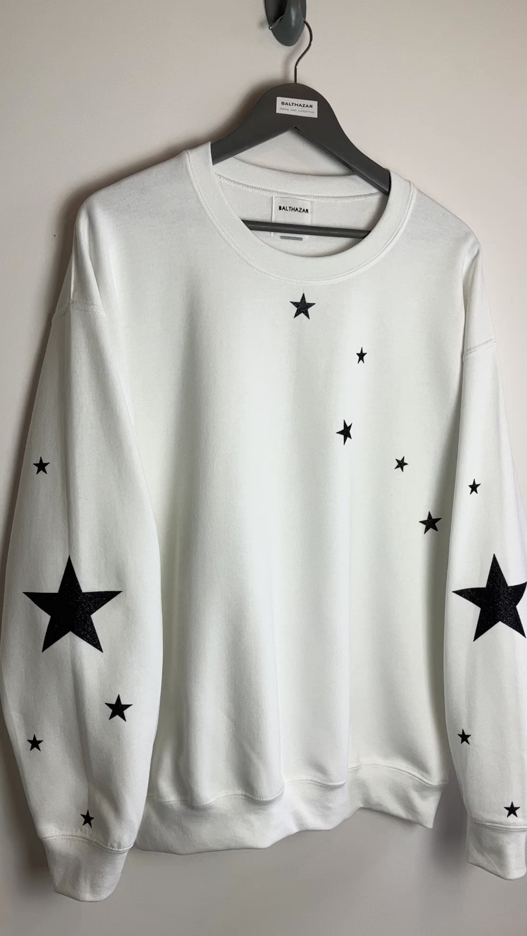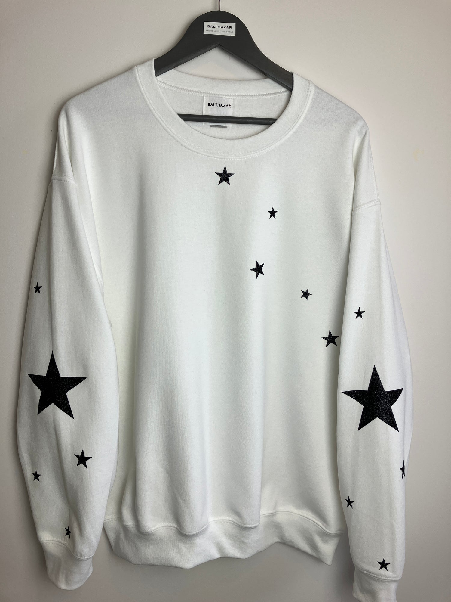 Shown here with Black glitter stars on white sweatshirt