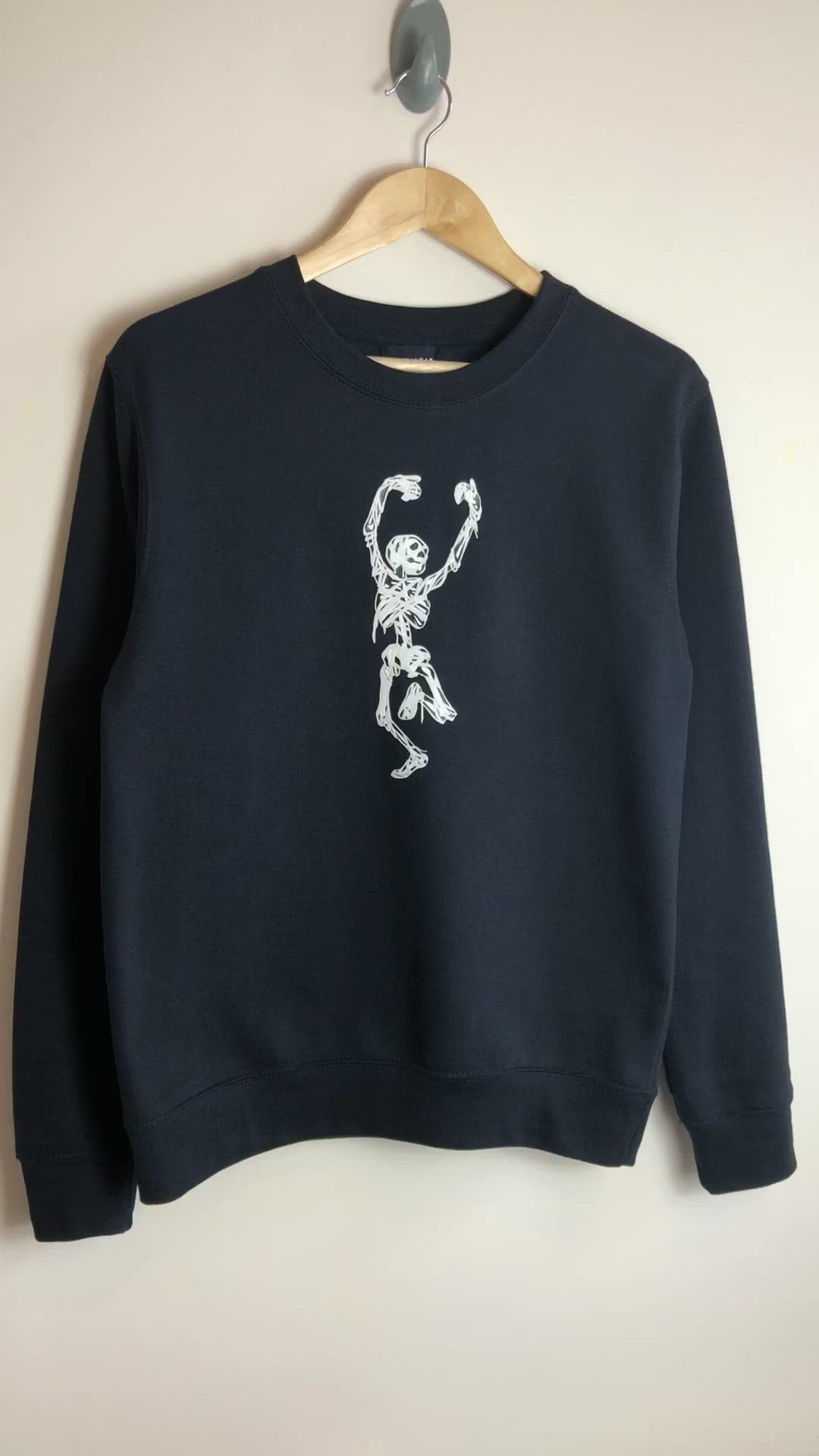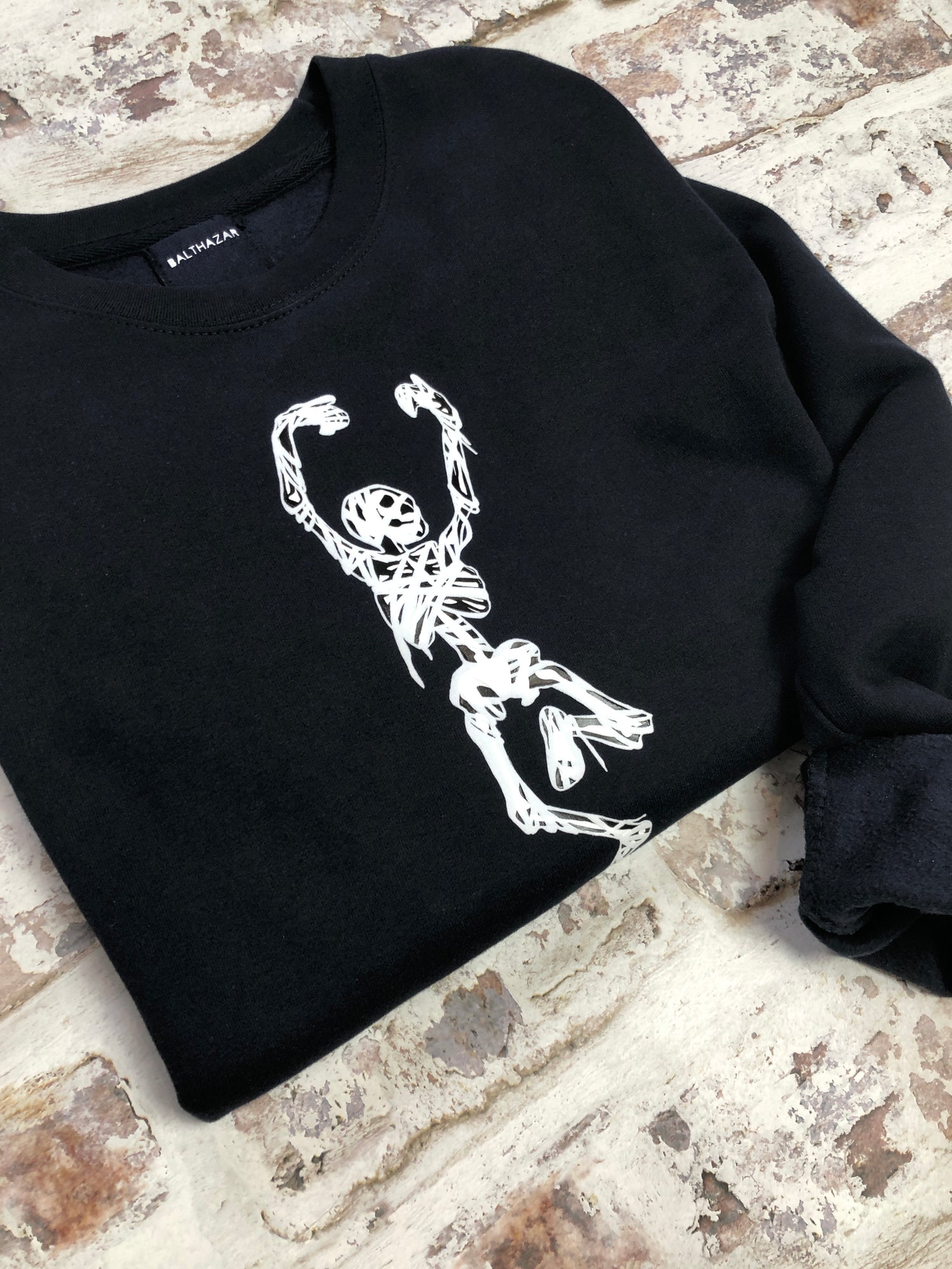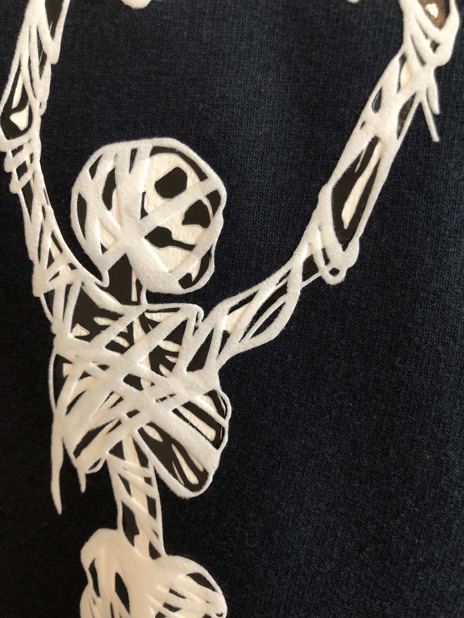 Flocked white vinyl wrappings drape off the dancing bones of our hand drawn skeleton as he boogies away