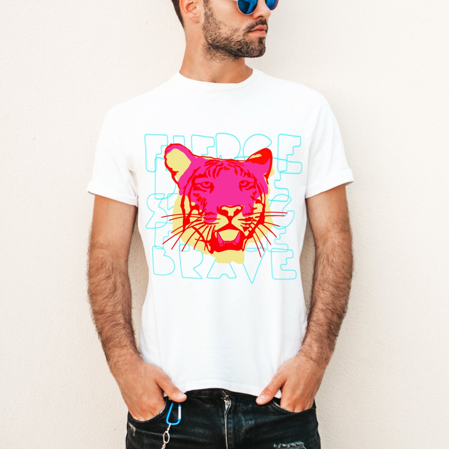 Our multi toned Tiger head; features a gorgeous mix of Neon red, pink and lemon sitting on top of Mint vinyl text ( FIERCE, BRAVE and STRONG).