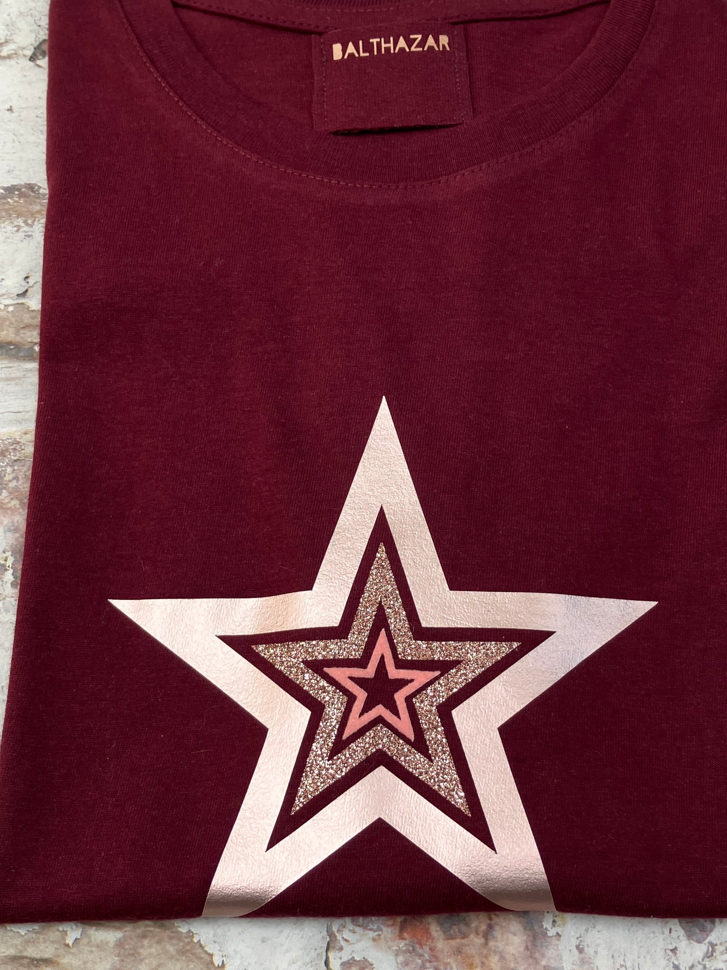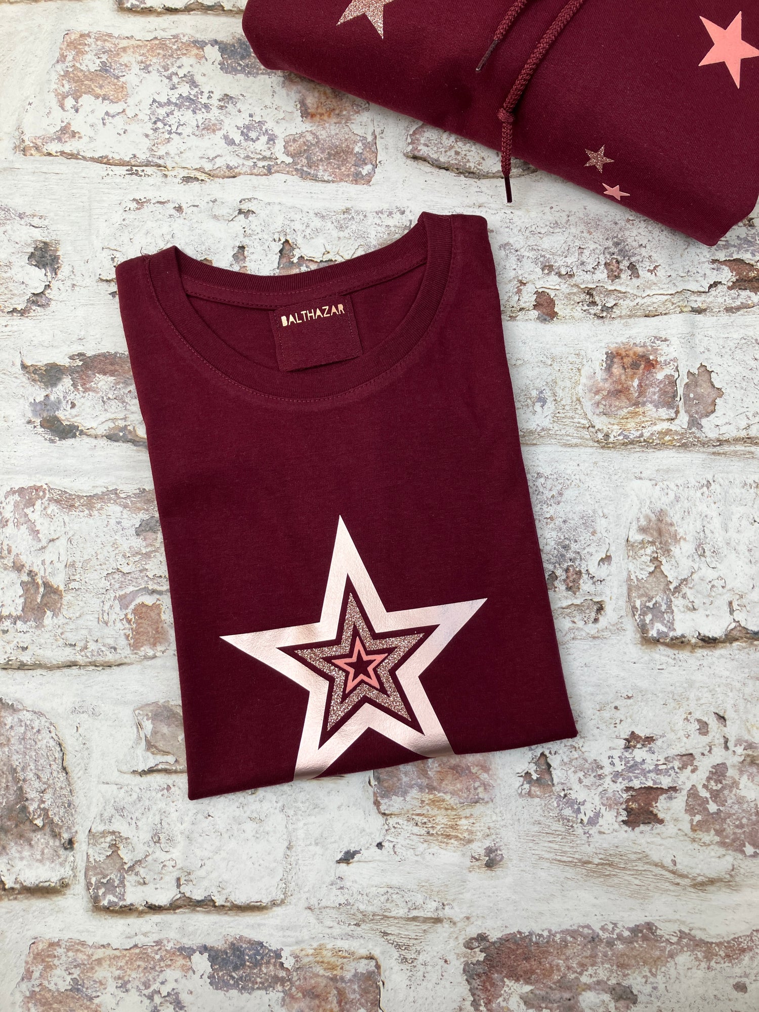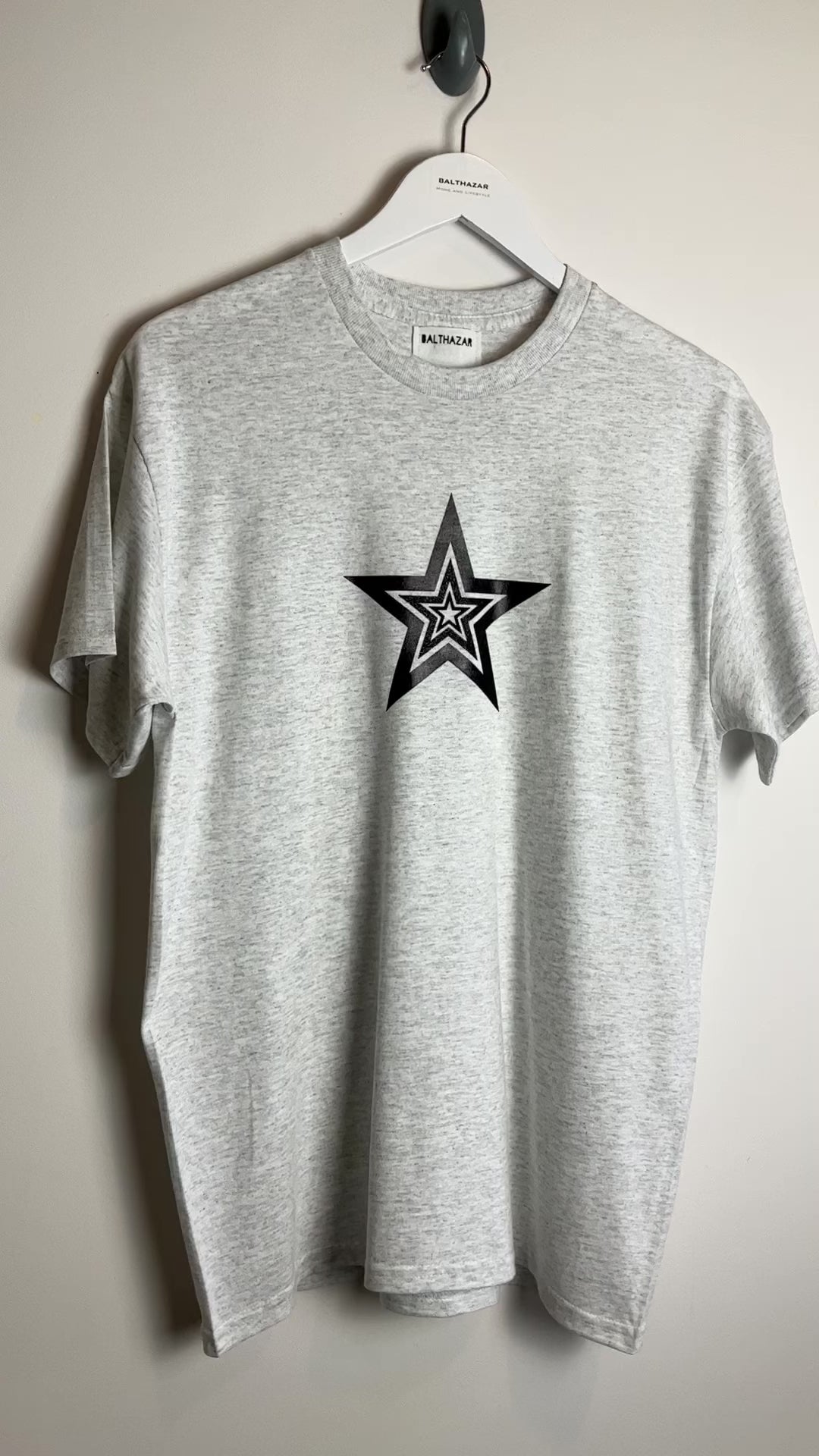 BLACK mix has metallic outer star, glitter and then a small black flock star on a white t-shirt.